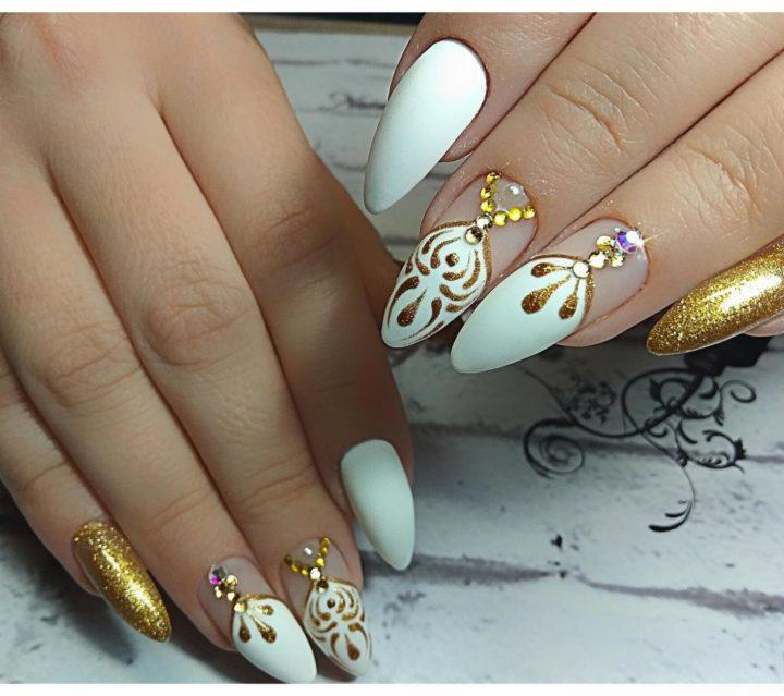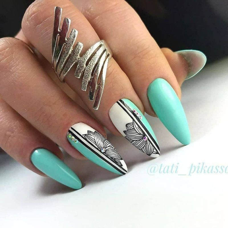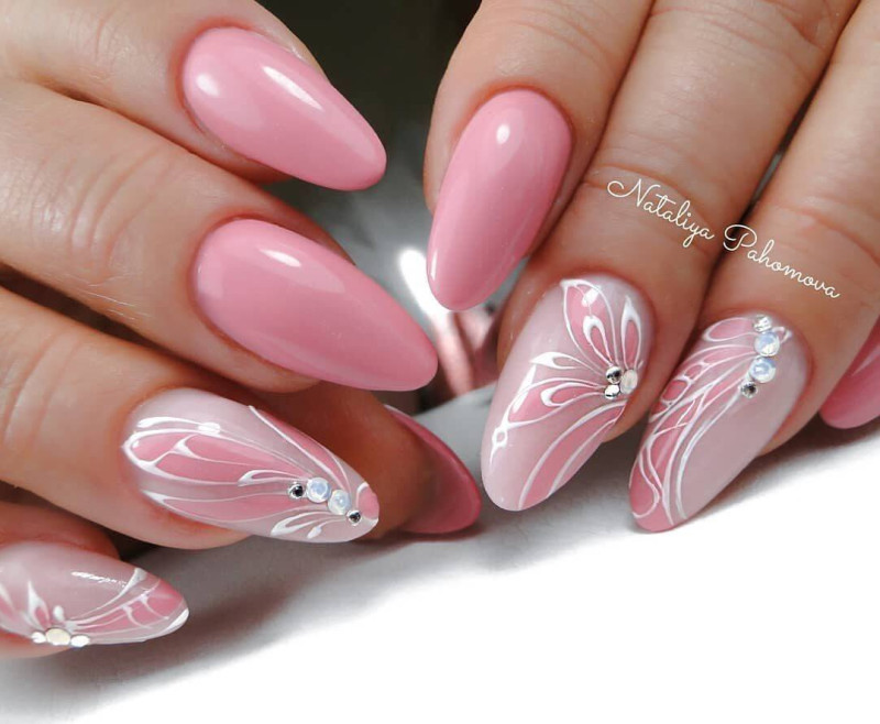 Для длинных ногтей можно выбрать более смелый и броский дизайн. Это сложные сюжетные рисунки, инкрустированные стразами, ярким глиттером или нежными узорами стемпинга. Очень красиво смотрится полоска цвета с блестками или блестками. Для элегантного маникюра используйте белое кружево на нескольких ногтях.