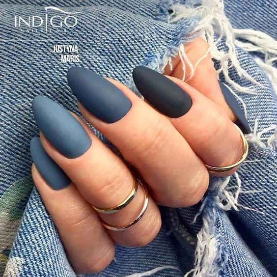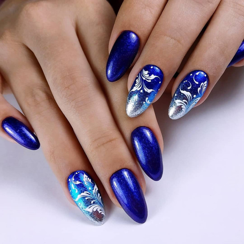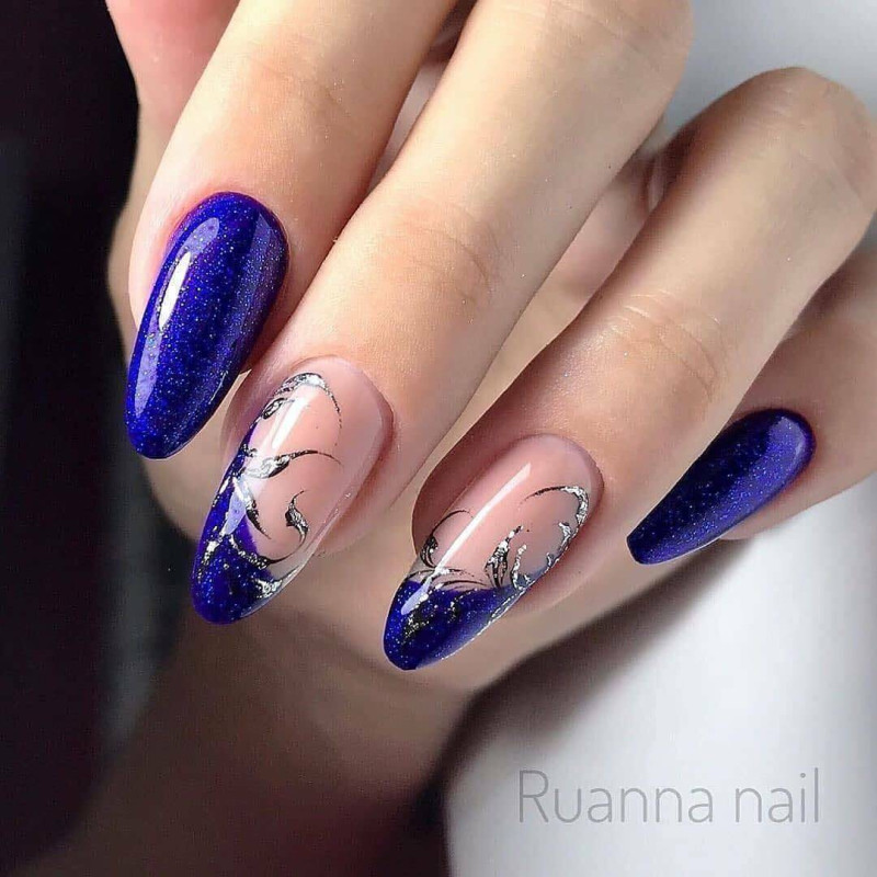В сезоне осень 2021 синий становится еще более актуальным. Матово-бархатное покрытие ногтей глубоких оттенков будет в тренде. На длинных ногтях стильно смотрится синий маникюр с блестящим серебристым декором. Модные тенденции, как на фото, помогут завершить образ.