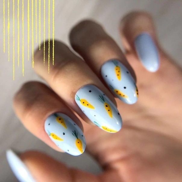 Изображения даров осени эффектно смотрятся в любом исполнении. Новинка нейл-арта — аэрографическая роспись. Фрукты смотрятся объемнее, а овощи выглядят натуральней, если использовать аэрограф. Наиболее популярные овощи и фрукты, которые можно встретить на ногтях современных модниц: