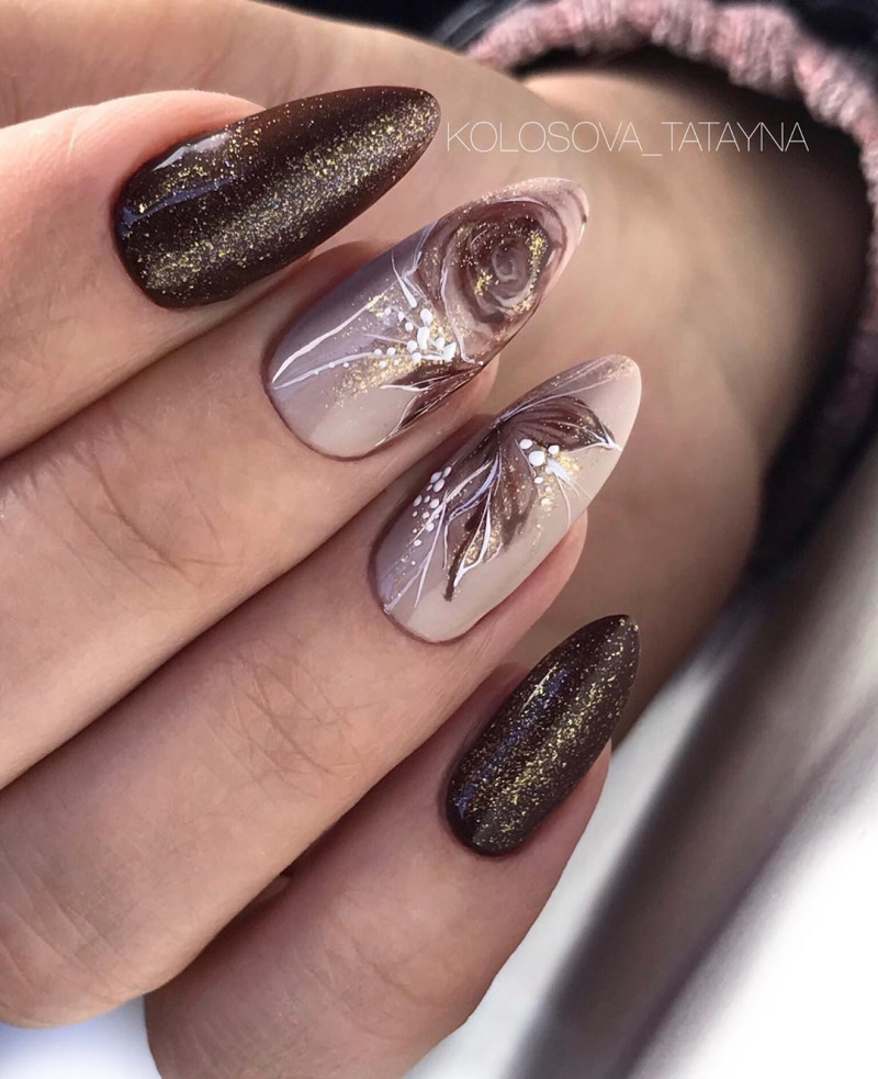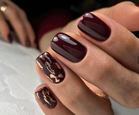 Оттенки насыщенного шоколада подходят к любому образу осеннего сезона 2021. Очень красиво коричневый маникюр смотрится на коротких ногтях, а в дизайне этот цвет отлично сочетается с теплыми золотыми блестками или фольгой.