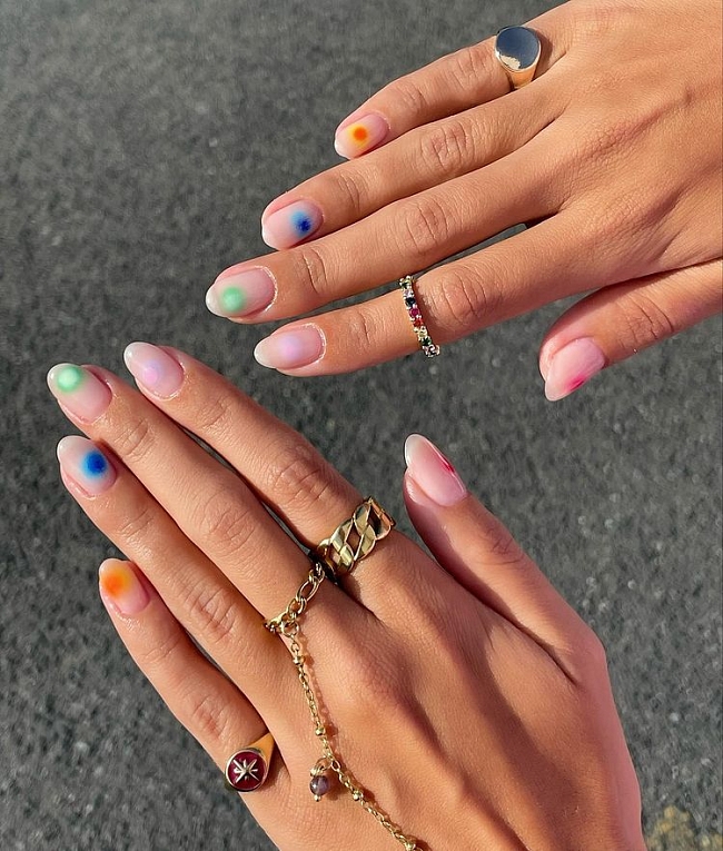 Гайд по осенним трендам в маникюре. Фото: @brightnails.nАбсолютный фаворит этой осени, который впервые появился летом, — маникюр «аура» (небольшая дымка по центру ногтя). Чтобы добиться такого эффекта, достаточно капнуть на непросохшее покрытие лак молочного оттенка. Кстати, цвет можно брать любой, который охарактеризует вашу ауру, будь то розовый или зеленый. Главное, при выполнении добиться воздушности изображения.