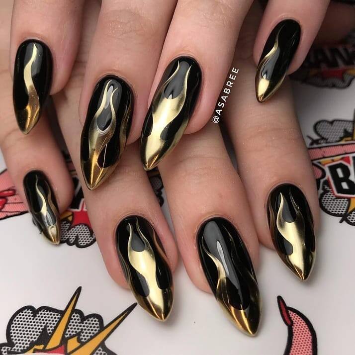 Гайд по осенним трендам в маникюре. Фото: @peachinailsЗолотая осень как бы намекает на то, что в маникюре тоже должно присутствовать золото. Тут можно пробовать использовать золотой лак или золотую фольгу (сусальное золото), которая отлично дополнит, например, черный маникюр или нюдовые оттенки. А можно выкрасить все ногти в этот цвет (особенно актуально для мужского маникюра!).