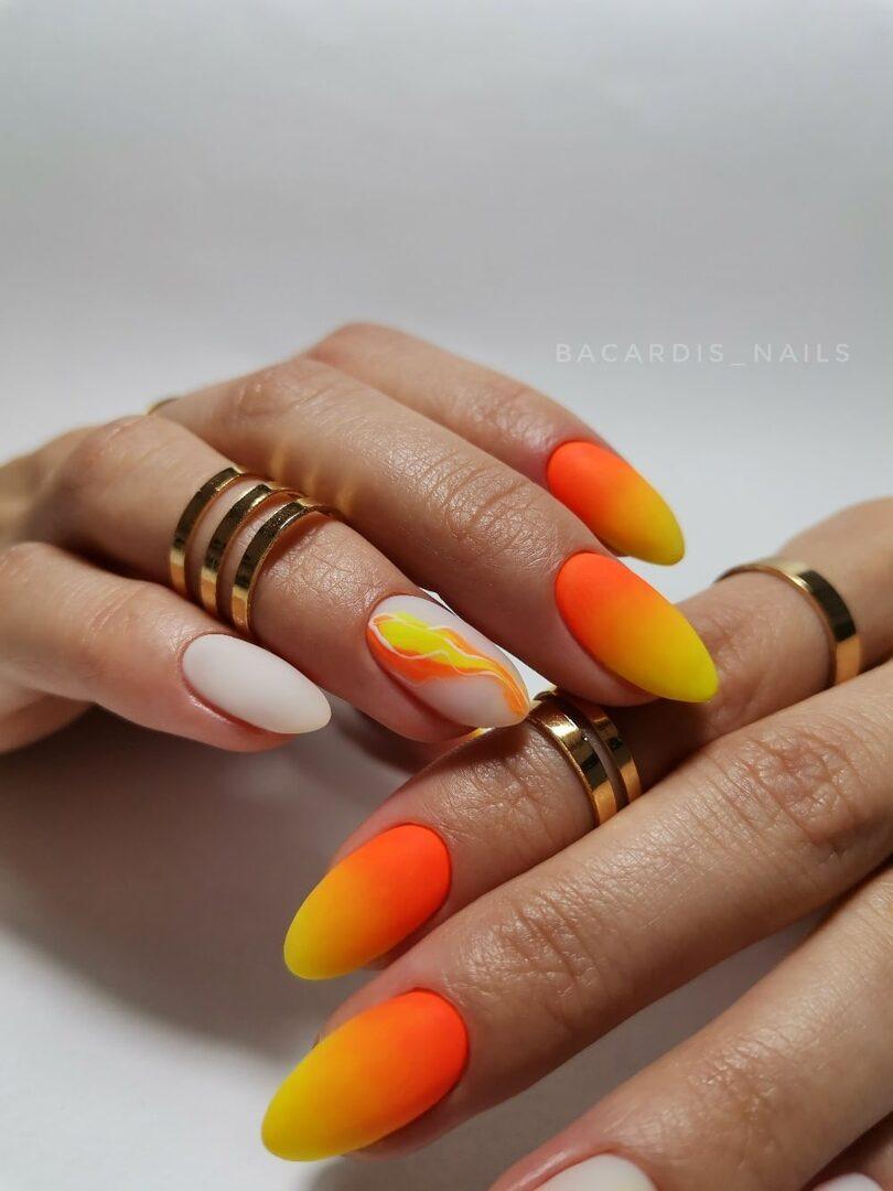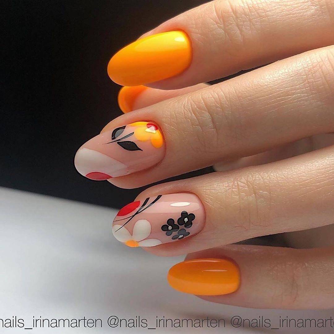 Оранжевый – один из цветов, наиболее часто встречающихся осенью в природе. Спектр его также широк, как и у красного — от горчичного до морковного. Ну а если однотонный маникюр для вас слишком скучен, всегда можно добавить чуточку глиттера.