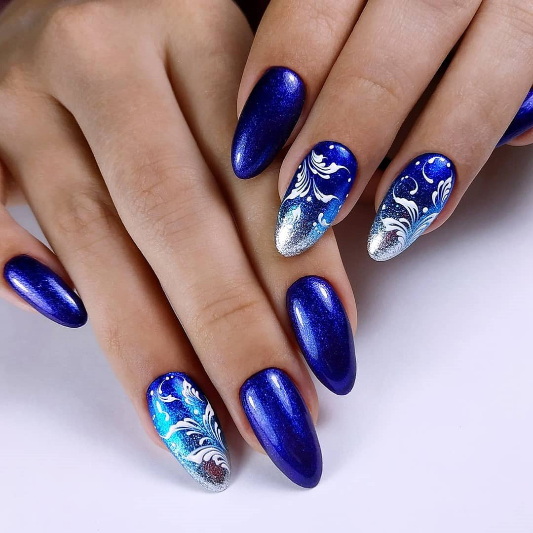 В сезоне осень 2021 синий становится еще более актуальным. Матово-бархатное покрытие ногтей глубоких оттенков будет в тренде. На длинных ногтях стильно смотрится синий маникюр с блестящим серебристым декором. Модные тенденции, как на фото, помогут завершить образ.