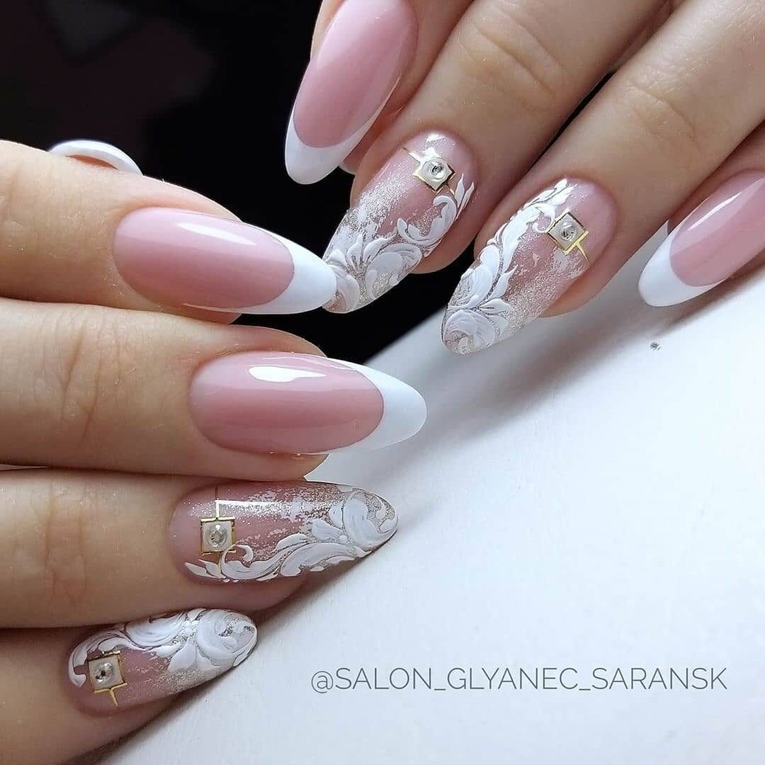 Для длинных ногтей можно выбрать более смелый и броский дизайн. Это сложные сюжетные рисунки, инкрустированные стразами, ярким глиттером или нежными узорами стемпинга. Очень красиво смотрится полоска цвета с блестками или блестками. Для элегантного маникюра используйте белое кружево на нескольких ногтях.