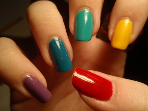 Однако между этими цветами обязательно должна быть природная гармония, чтобы яркий разноцветный маникюр одновременно притягивал внимание, но не казался вульгарным