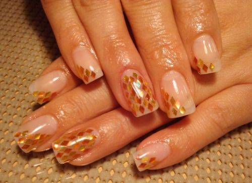 - Французский маникюр с блестками выполняется на готовых ногтях, наращенных стандартным способом.