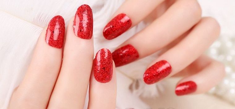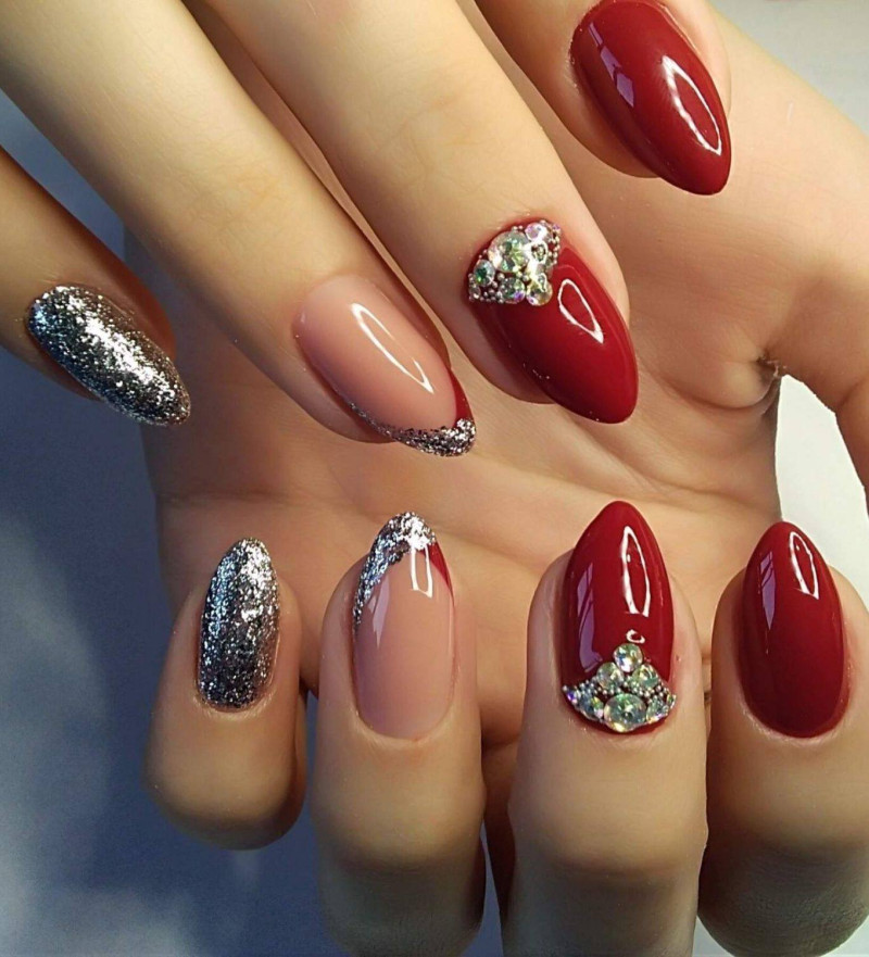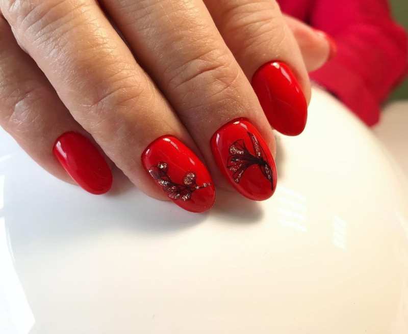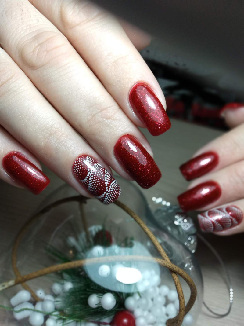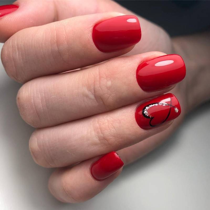 На коротких ногтях рекомендуется использовать темные оттенки красного цвета. Слишком детские розоватые тона лучше отложить на весенние нейл-арты с флористикой. На короткой ногтевой пластине желательно размещать однотонные нейл-арты с блестками, выделять 1-2 ноготка сплошным слоем глиттера.