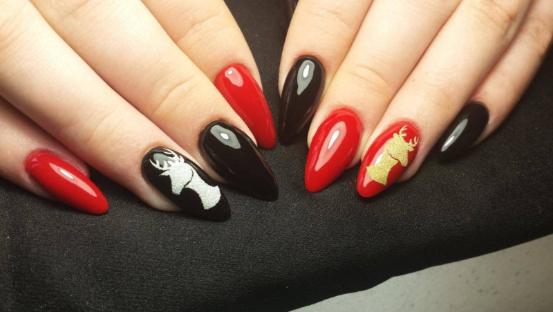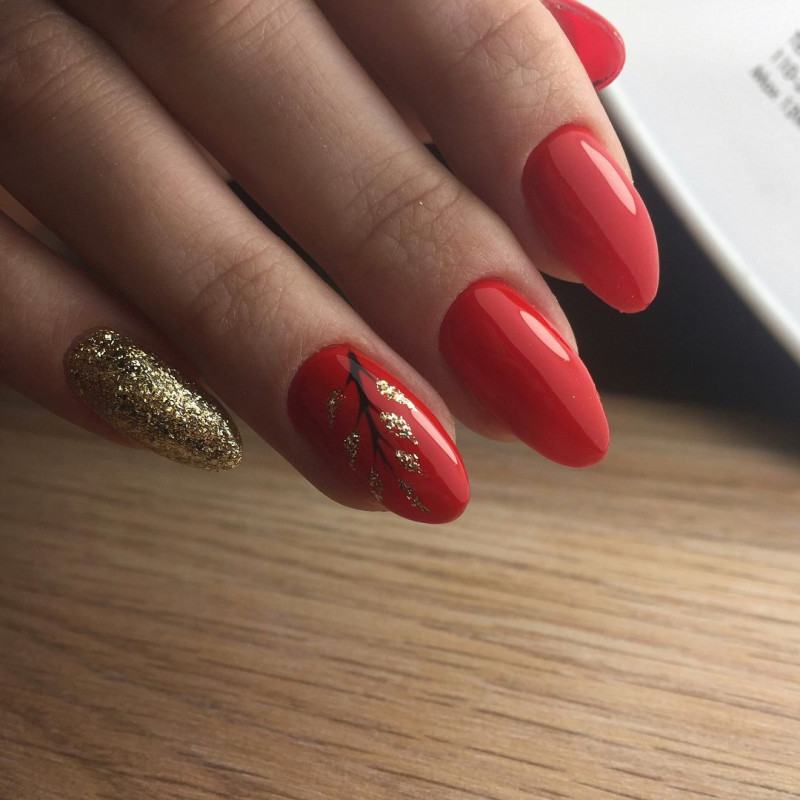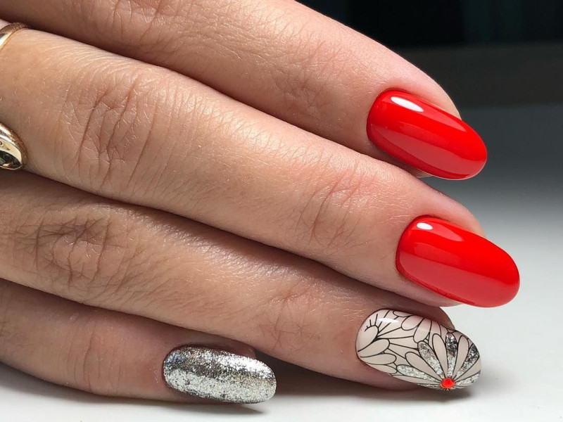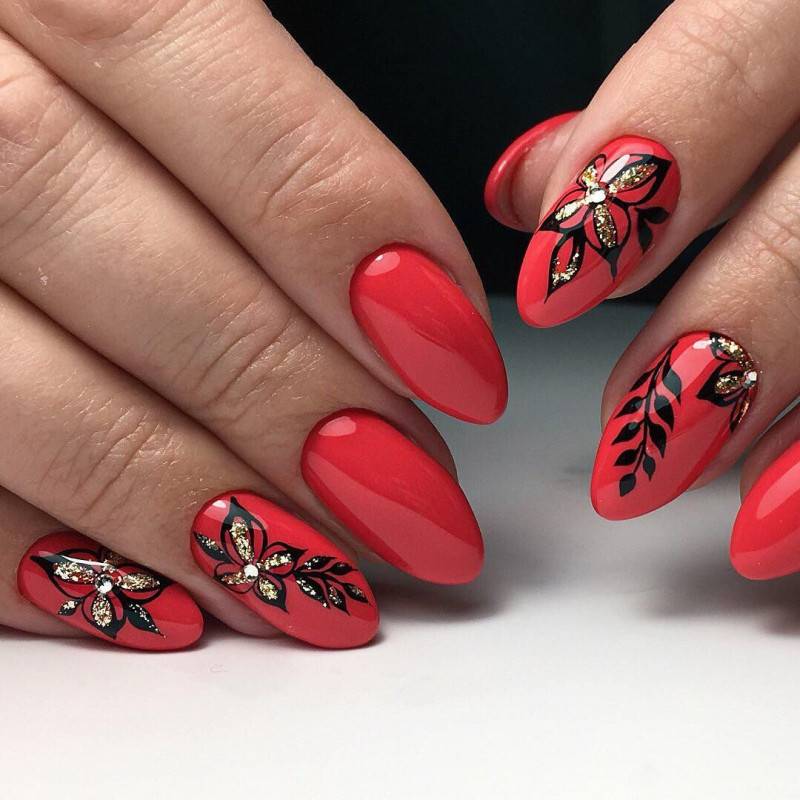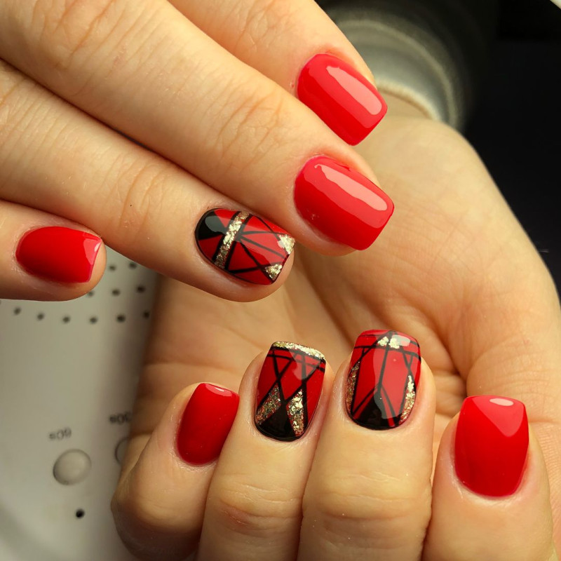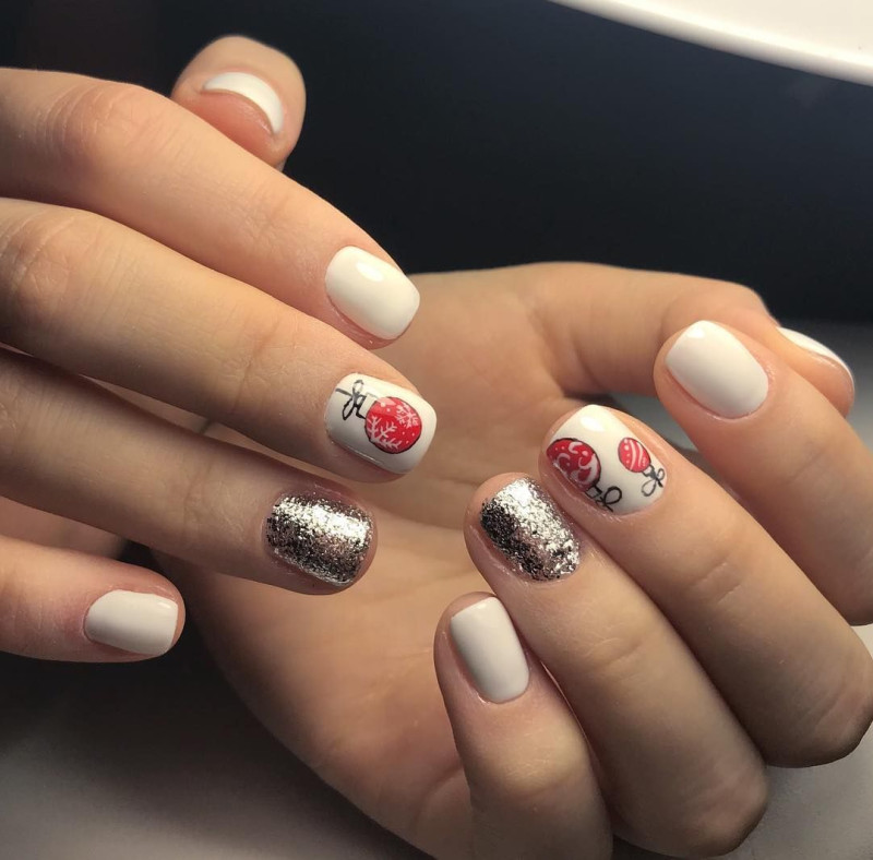 На коротких ногтях рекомендуется использовать темные оттенки красного цвета. Слишком детские розоватые тона лучше отложить на весенние нейл-арты с флористикой. На короткой ногтевой пластине желательно размещать однотонные нейл-арты с блестками, выделять 1-2 ноготка сплошным слоем глиттера.