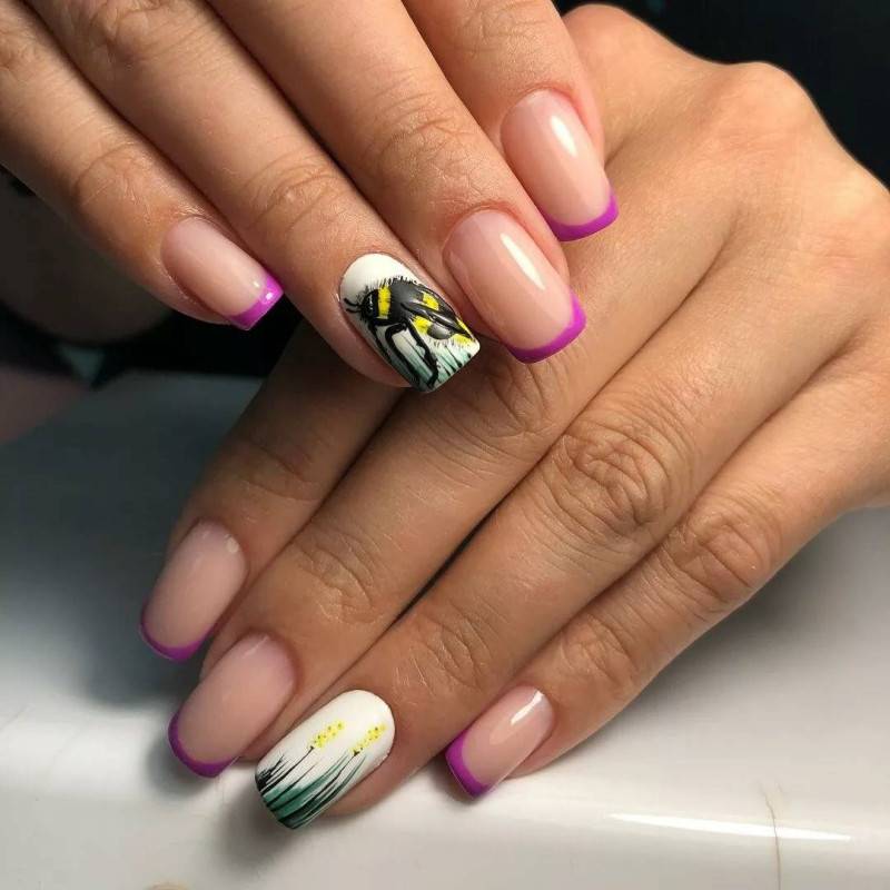С осторожностью для такого французского маникюра нужно выбирать и форму каймы — асимметрия и угловые варианты могут как вытянуть пластину, так и сделать ее короткой и широкой. Предпочтительнее классический вариант французского маникюра