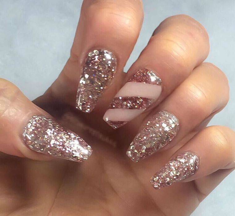 Нынче мастера нейл-арта выкладывает блестки в виде вертикальных, горизонтальных и диагональных полос, формируя при этом то же самое омбре, только в несколько видоизмененном формате.