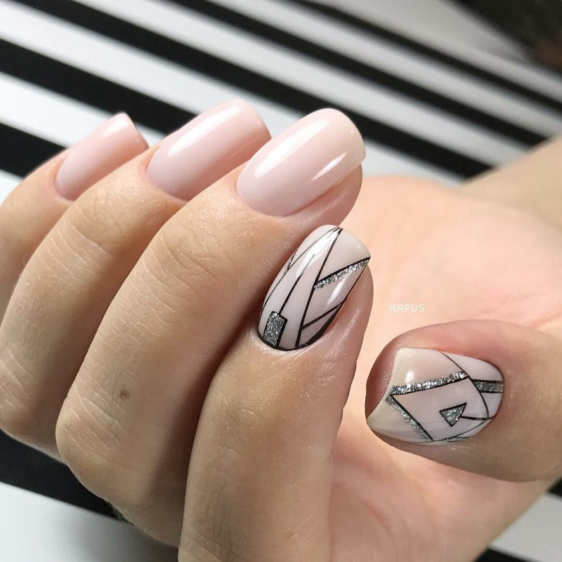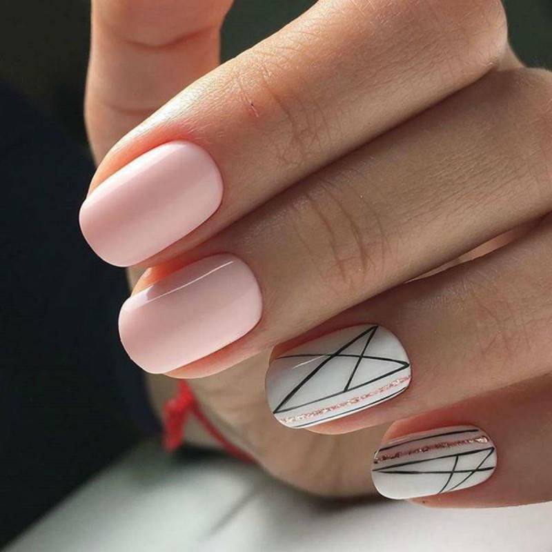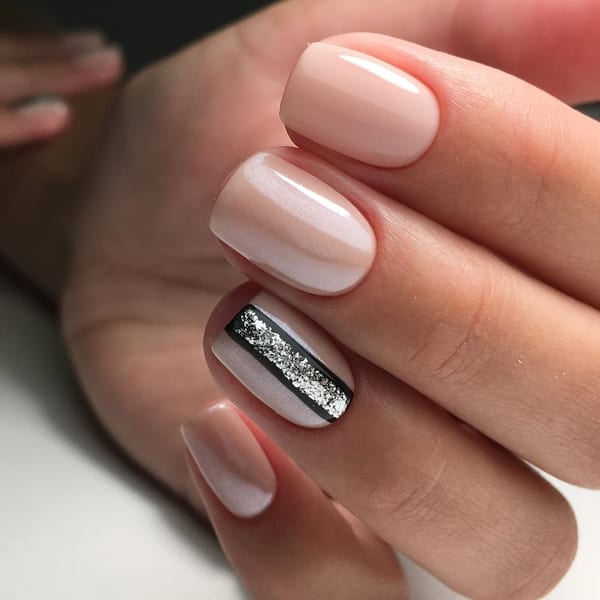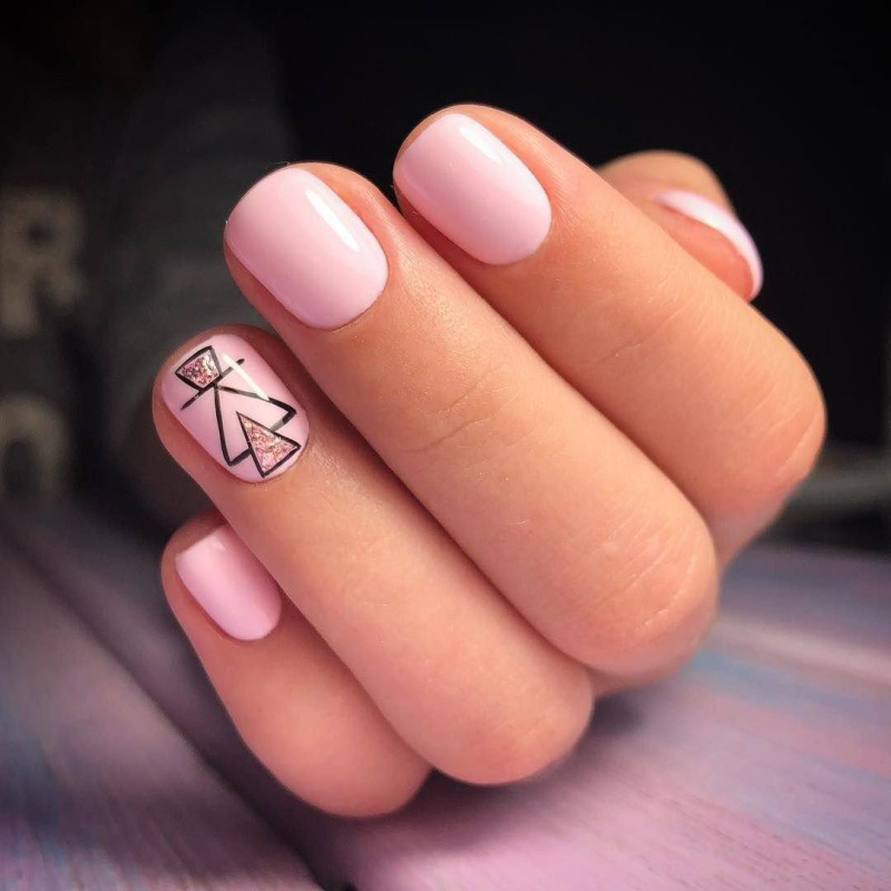 Выразительным станет нейл-арт в светло-розовом оттенке, если на одном из пальцев нарисовать черную вертикальную линию и сверху ее покрыть глиттером.