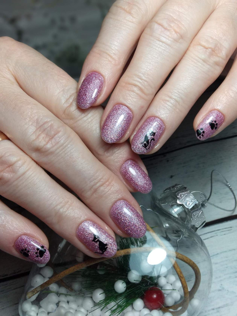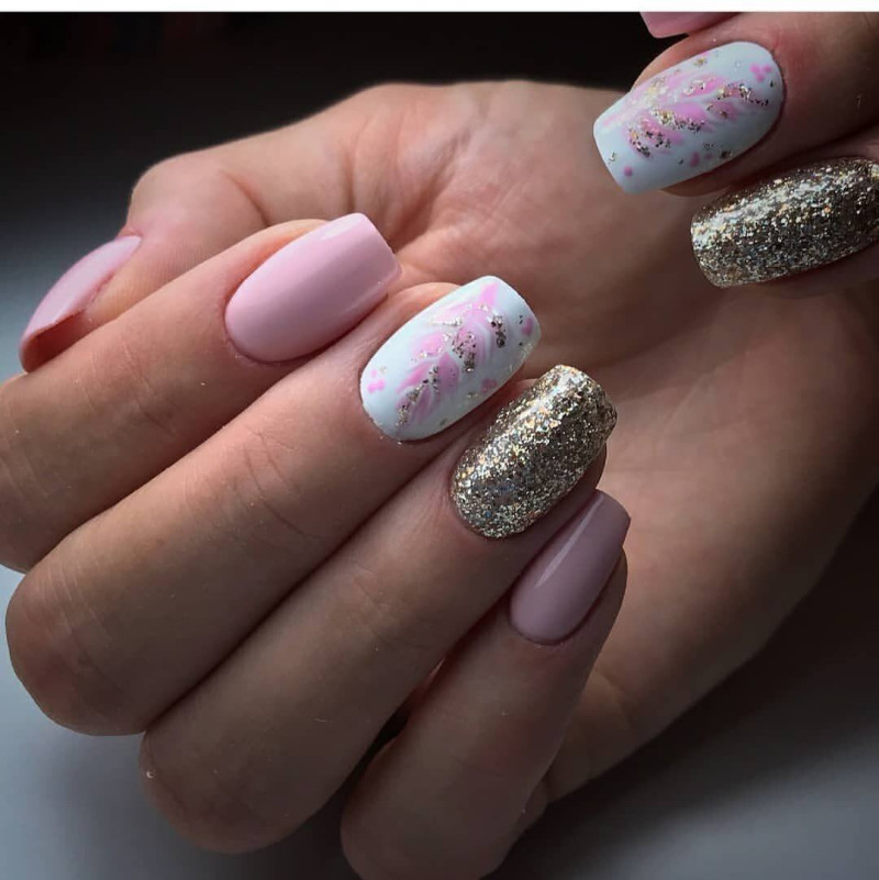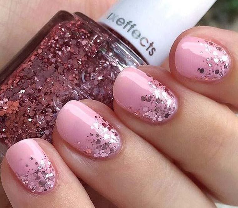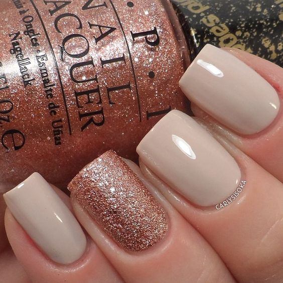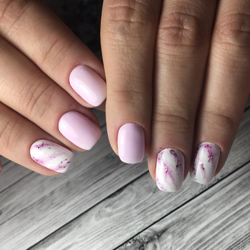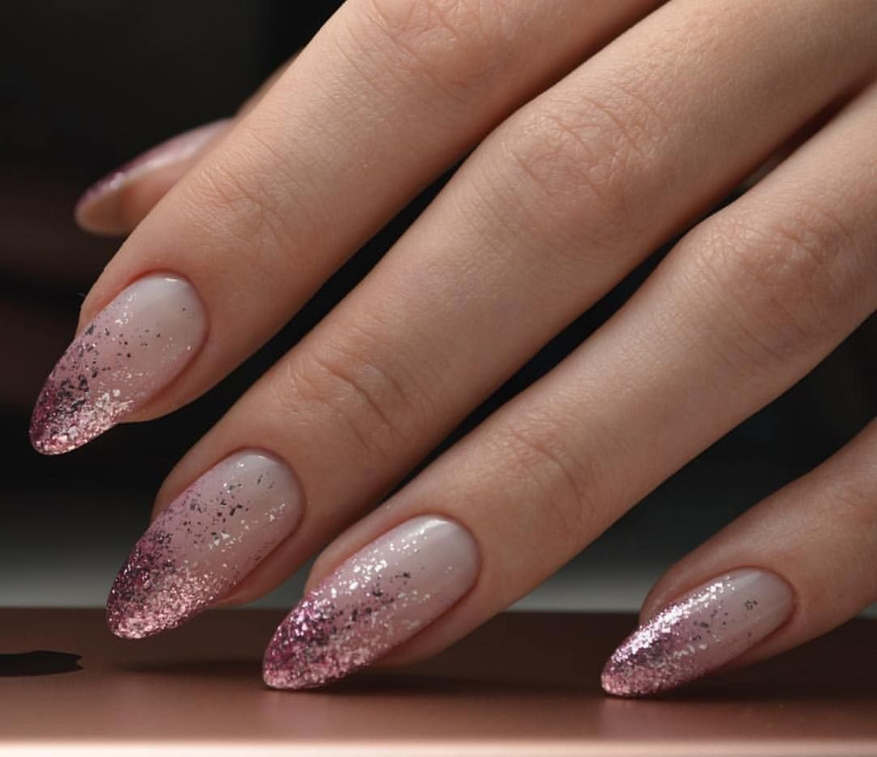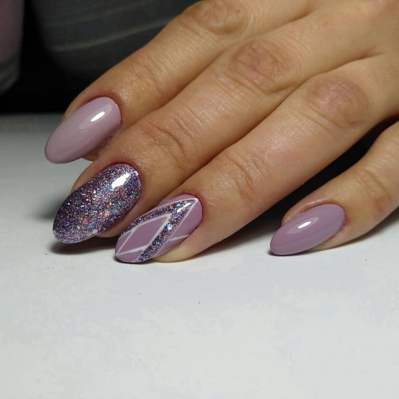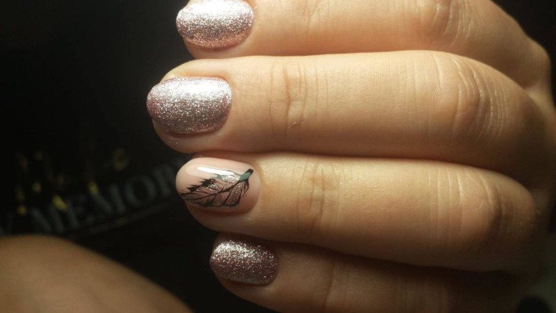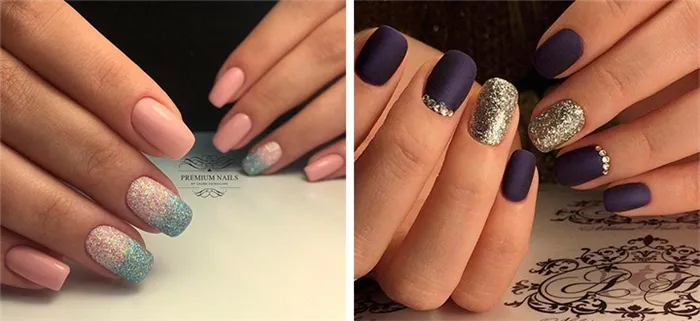 Отлично смотрится маникюр в сочетании, в котором оттенок лака чуть светлее оттенка блесток или наоборот.