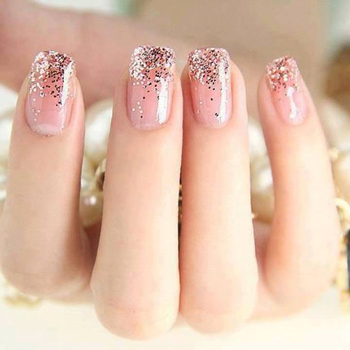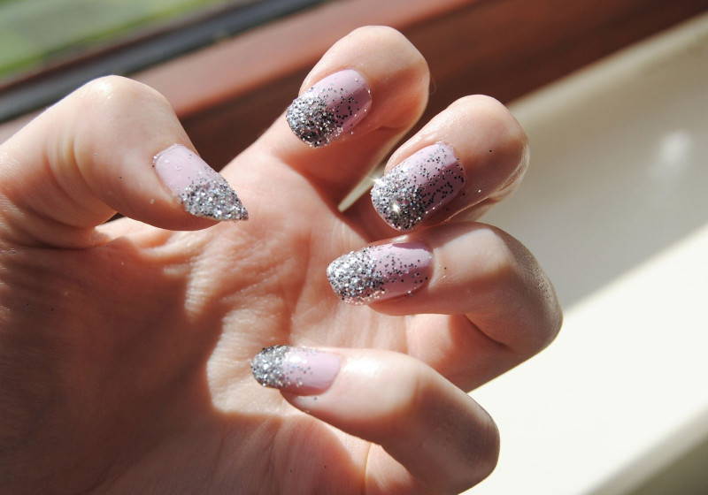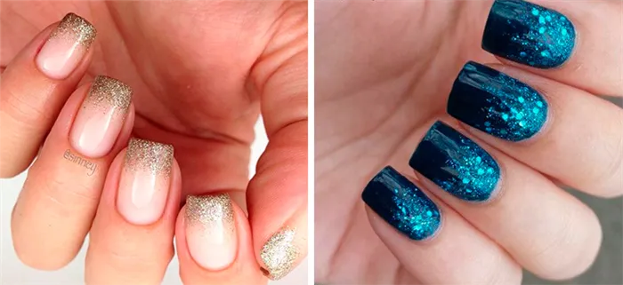 Сухие блесточки аккуратно удаляются, а приклеившиеся размещаются по всему ногтю так, чтобы их количество равномерно уменьшалось. При использовании готовых блесток, лак наносится тонким слоем на основание ноготка и вытягивается по всей поверхности.
