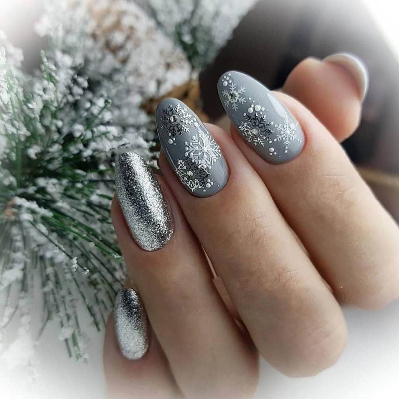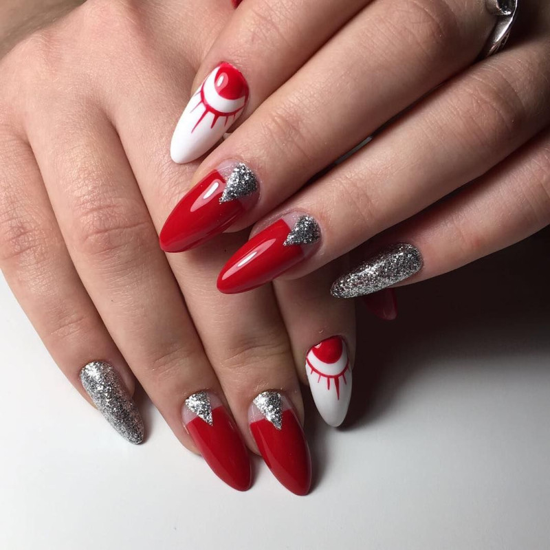 Отлично смотрится маникюр с серебряной и радужной фольгой, френч с блестками по краю ногтевой пластины. Для торжественных образов выполните красный маникюр с круглыми пайетками. Выбирайте темный материал, чтобы он был хорошо заметен на ногтевой пластине.