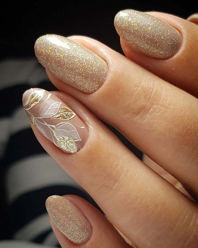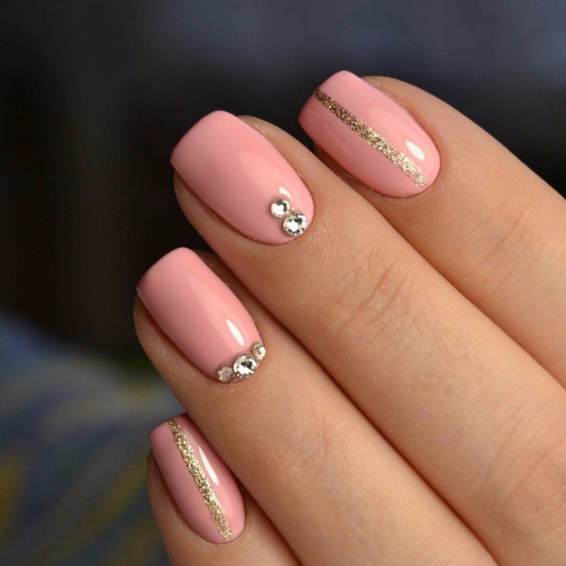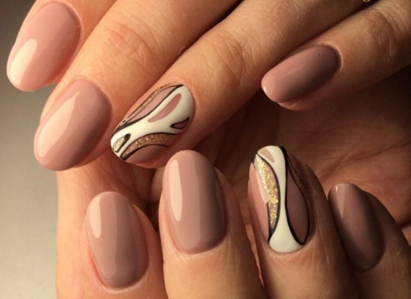 Нюдовый. Растяжка блестками на нюдовой основе смотрится одинаково стильно, как на длинных, так и на очень коротких ногтях. Как и в случае с белоснежным покрытием, в данном случае уместными будут полупрозрачные основы, так и высокопигментированные бежевого или коричневого цвета. А вот блестки должны быть исключительно золотого цвета, иначе готовый нейл-арт будет выглядеть грубо и неопрятно.