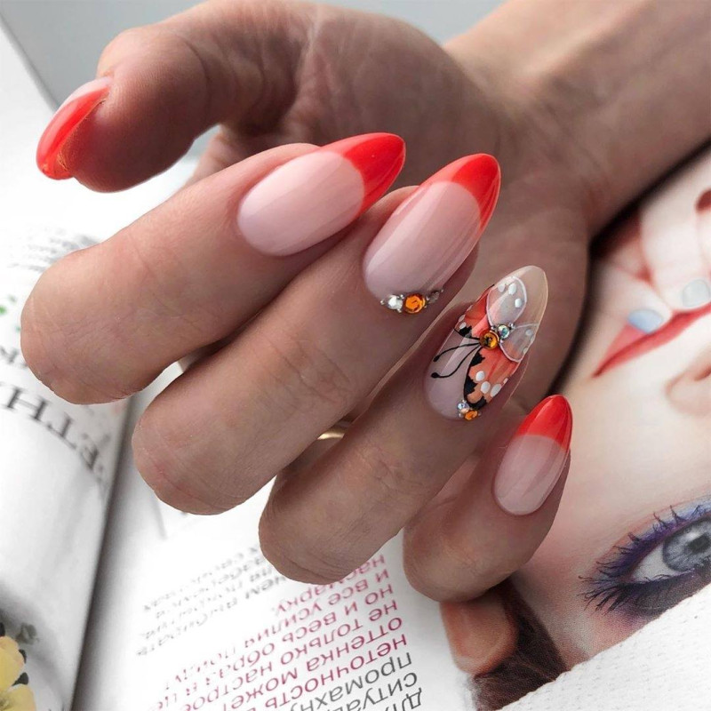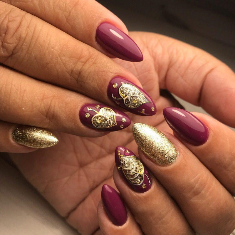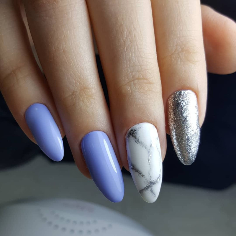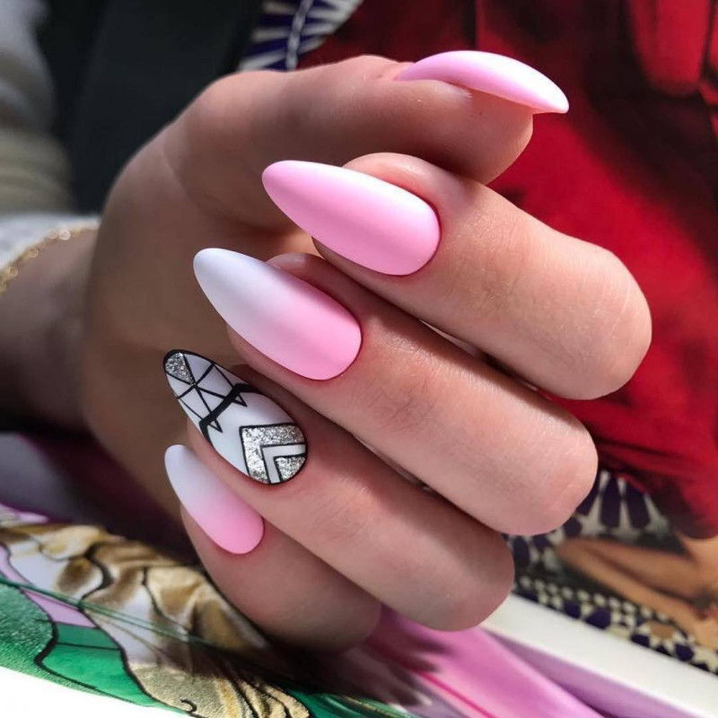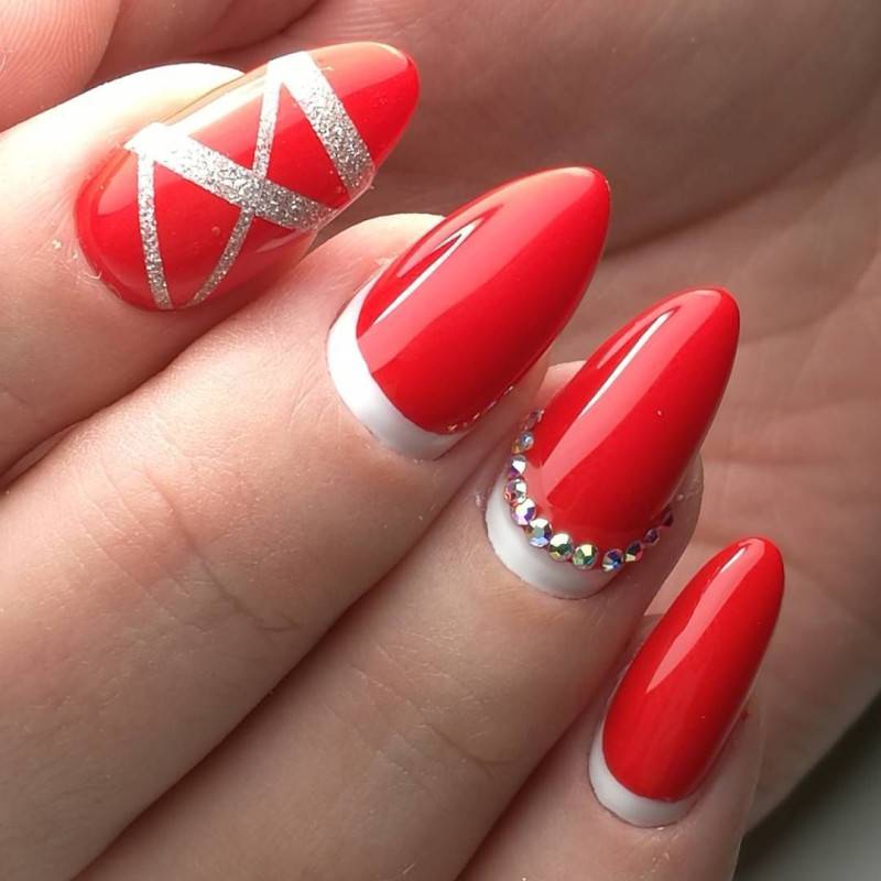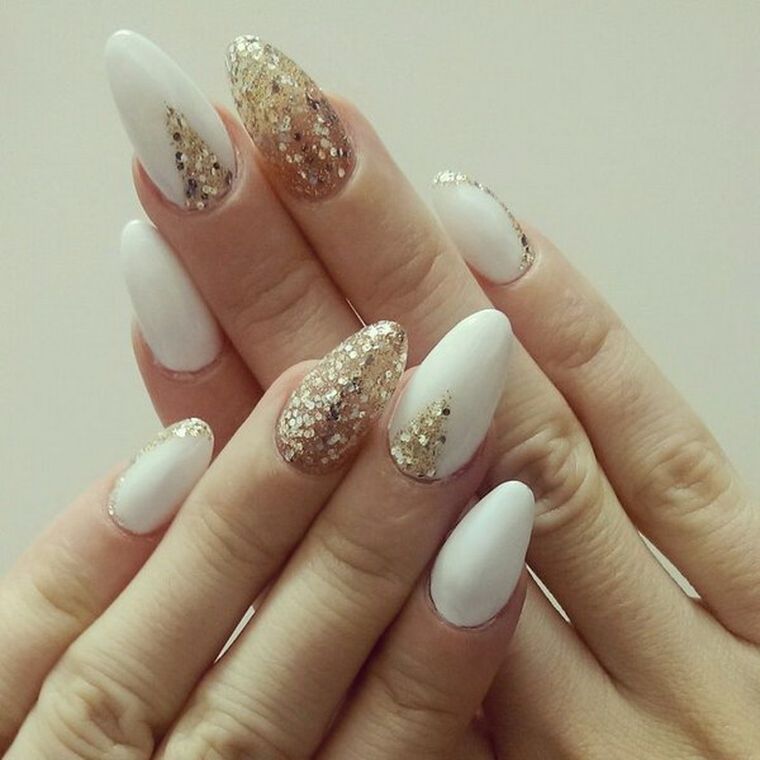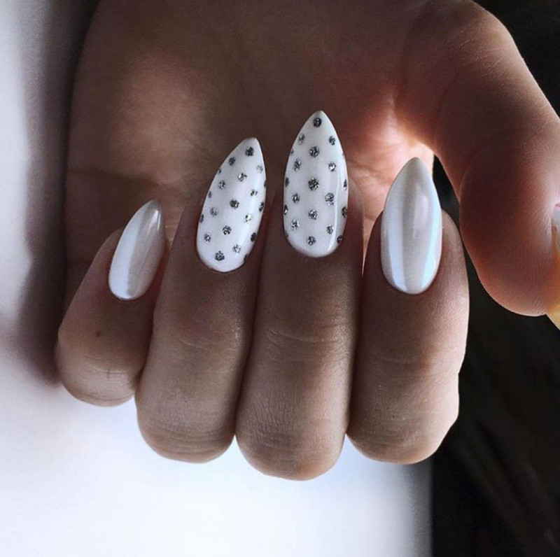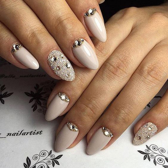 Миндальная форма универсальна и женственна. Не стоит выбирать слишком резких и четких линий. Лучше выбирать округлые формы кончика ногтя.Другие варианты декора — вертикальные полоски блестками, оформление одного двух ногтей или лунок.