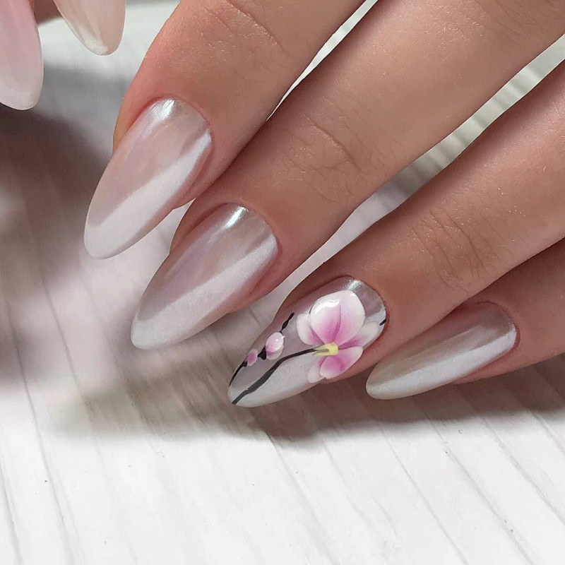 С рисунками. Дополнить маникюр, в котором один ноготок выделен блестящим градиентом можно с помощью рисунков. Это могут быть, как простые изображения веточек, бутонов цветов, сердечек или надписей, так и полноценные художества, которые тоже должны располагаться лишь на одном пальце. В противном случае вы рискуете перегрузить дизайн.