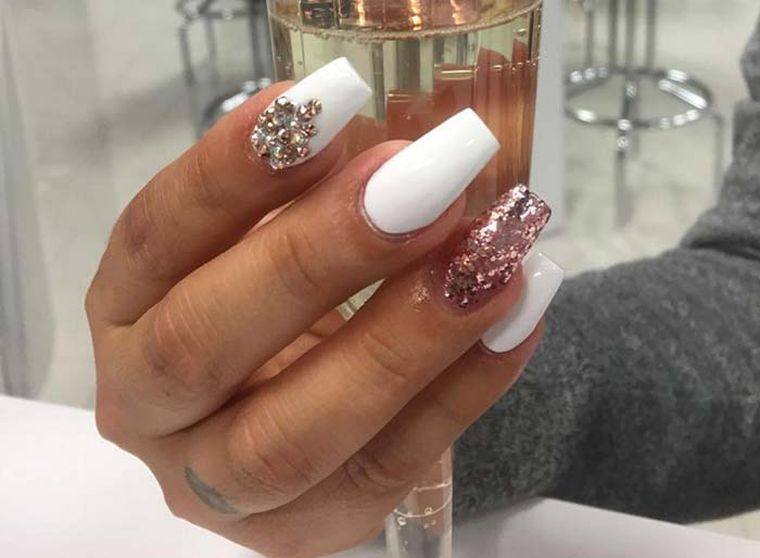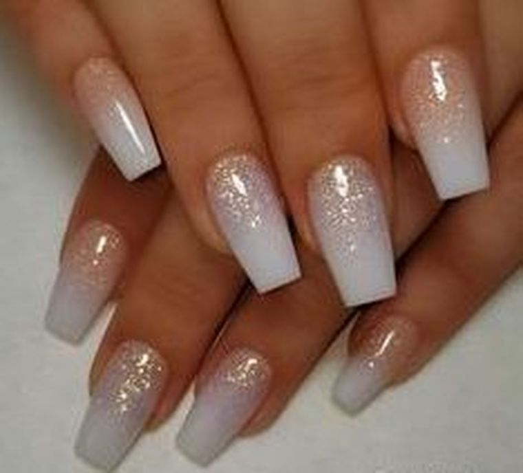 Белоснежный. В дуэте с блестящей растяжкой эффектно смотрится абсолютно любой лак, выдержанный в белоснежной гамме. Допустимы в данном случае, как полупрозрачные покрытия молочного, так и высокопигментированные белого цвета. Что до самых блесток, это могут быть варианты в виде песка или пыли, так и ажурный глиттер. Выкладывать их можно лишь на кончиках пластин, тем самым создавая нечто подобное французскому маникюру. Также блестками можно покрыть большую часть ноготка, имитируя подтеки. Ещё один вариант — это создать из шиммера разных цветов своеобразное омбре с контрастными переходами, которое должно украшать исключительно один палец.