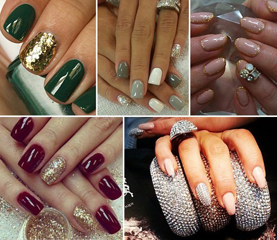 Блестки часто дополняют стразами, бульонками, камнями и другим объемным декором. Это позволяет разнообразить маникюр, сделать его интереснее. Размер и форму стразов выбирайте в зависимости от цели выполнения маникюра. Если речь идет о повседневных нейл-артах, то камни лучше расположить в прикорневой зоне одного из ноготков. В торжественных нейл-артах выполните выкладку стразами на безымянном пальце, а остальные ноготки окрасьте в однотонный яркий оттенок.