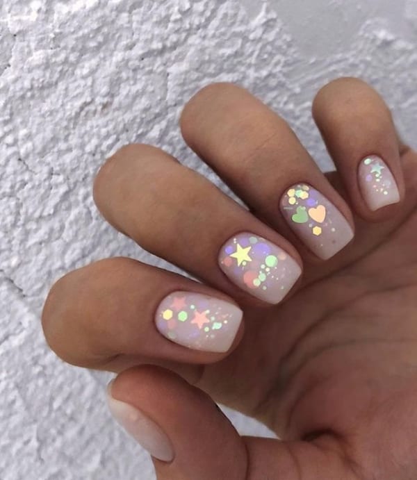 Такие украшения для ногтей, как блестки, одинаково хорошо смотрятся как на длинных, так и на коротких ногтях. Вы можете покрыть блестками один ноготь или несколько, частично или полностью, использовать разные цвета, экспериментировать с размером украшения и бесконечными дизайнами… Вот несколько примеров дизайна с блестками на коротких ногтях.