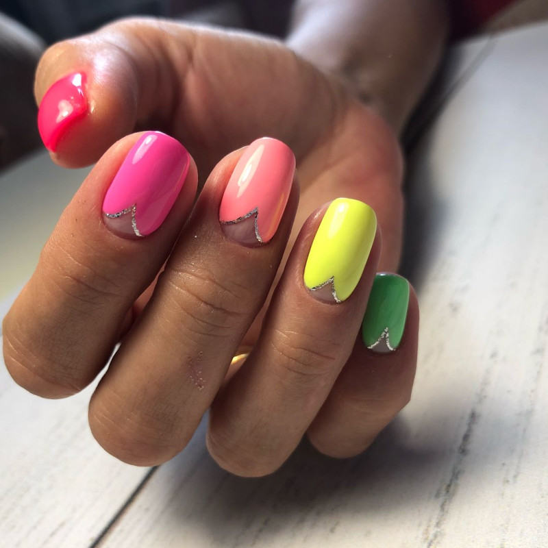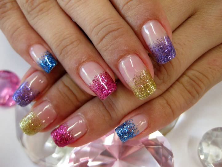 Цветной французский дизайн давно стал привычным. Актуален не только моно декор, но и разноцветная окраска ногтей. Для каждого можно выбрать свой оттенок глиттера. Интересный вариант — оформите руки с чередованием или повтором оттенков.