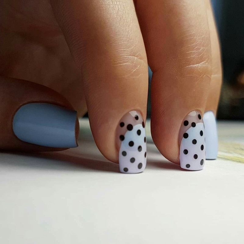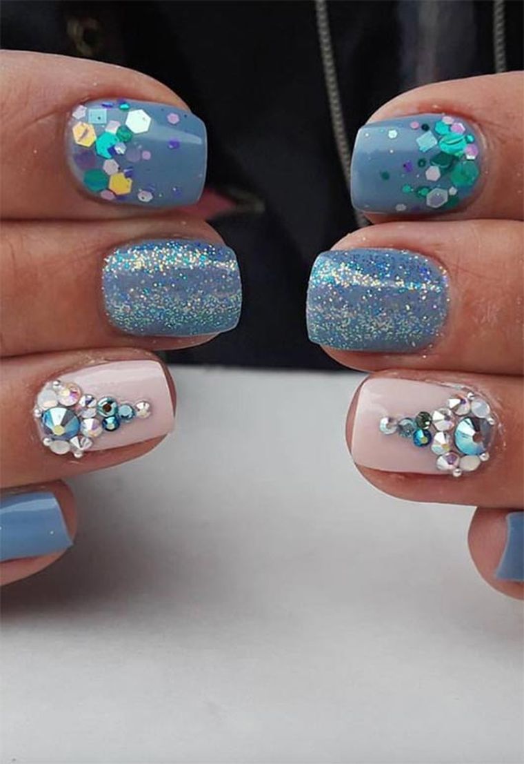 Удивительно сочетается розовый лак с синим сияющим «горошком». Этот дизайн ногтей с блёстками прекрасно смотрится на коротких ногтях.