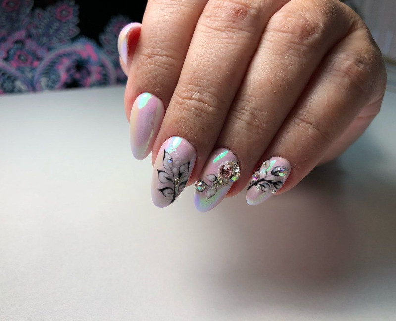 - Стоит учитывать, что большое количество блестящих деталей зрительно увеличивает ноготь, придает тяжелый аляпистый вид.