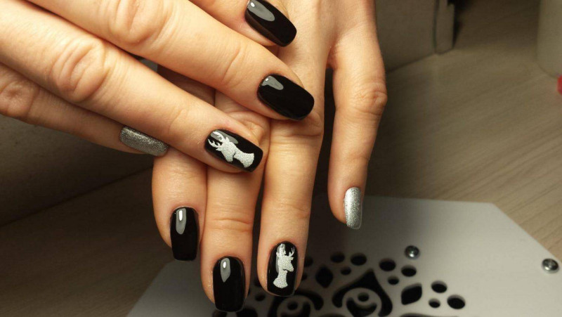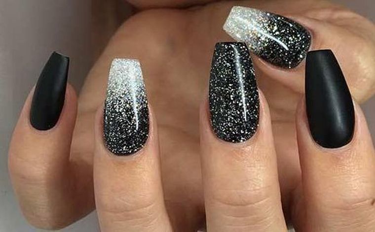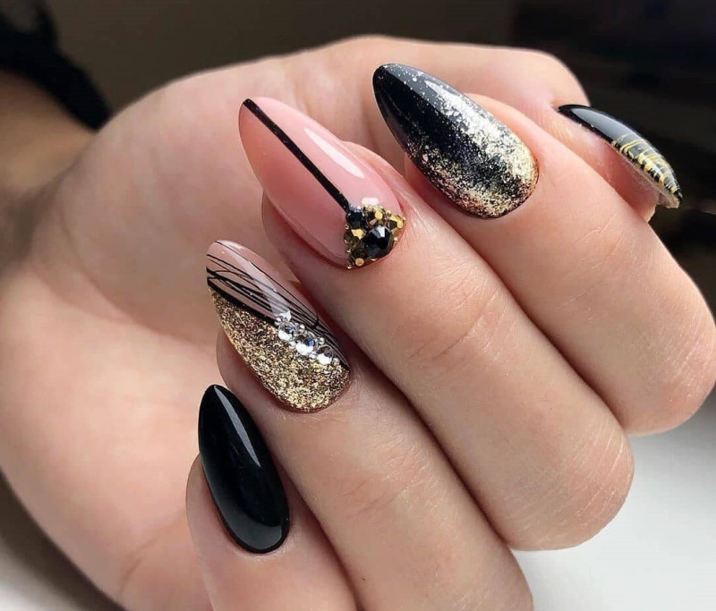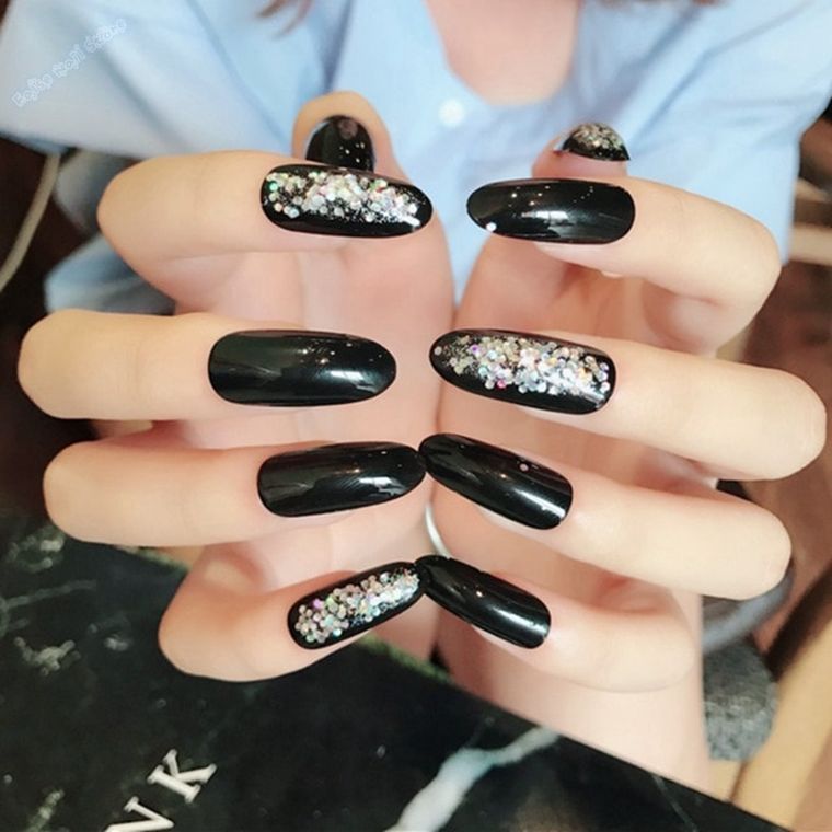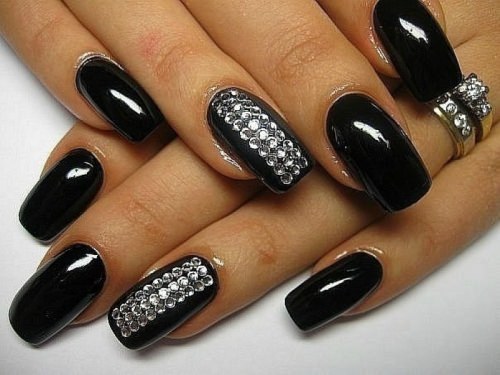 Чёрный дизайн маникюра с дополнением в виде блёсток