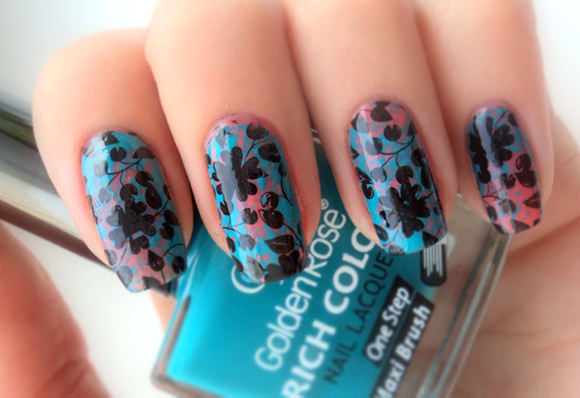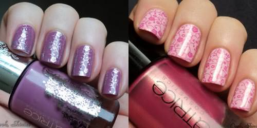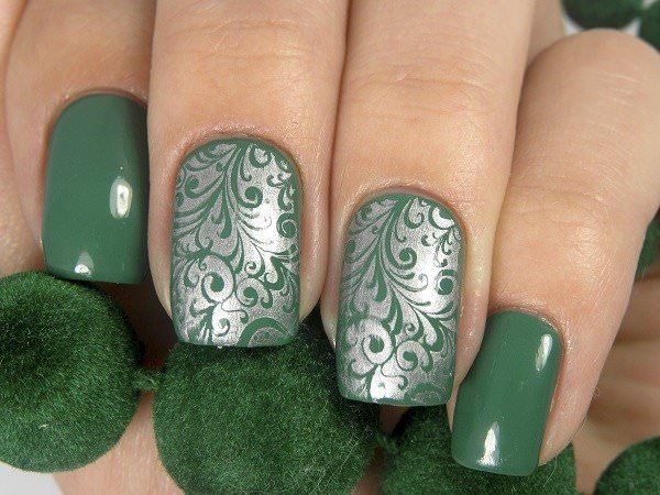 Искрящийся маникюр великолепно сочетается с популярным стемпингом – изящным рисунком. Наносят печатные картинки не на все ногти, а выборочно, часть ограничиваются ноготком на безымянном пальце.