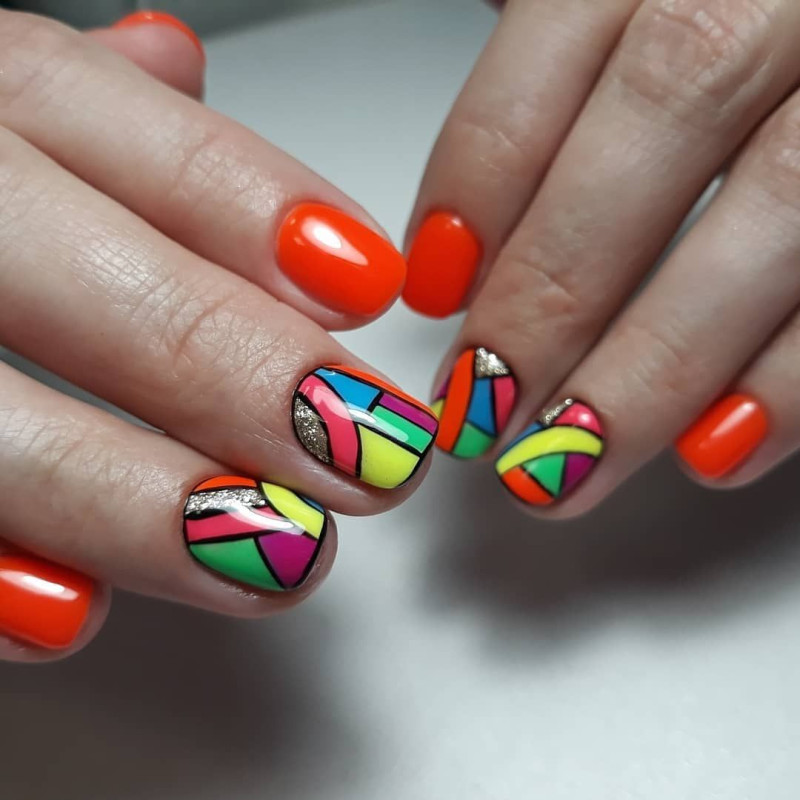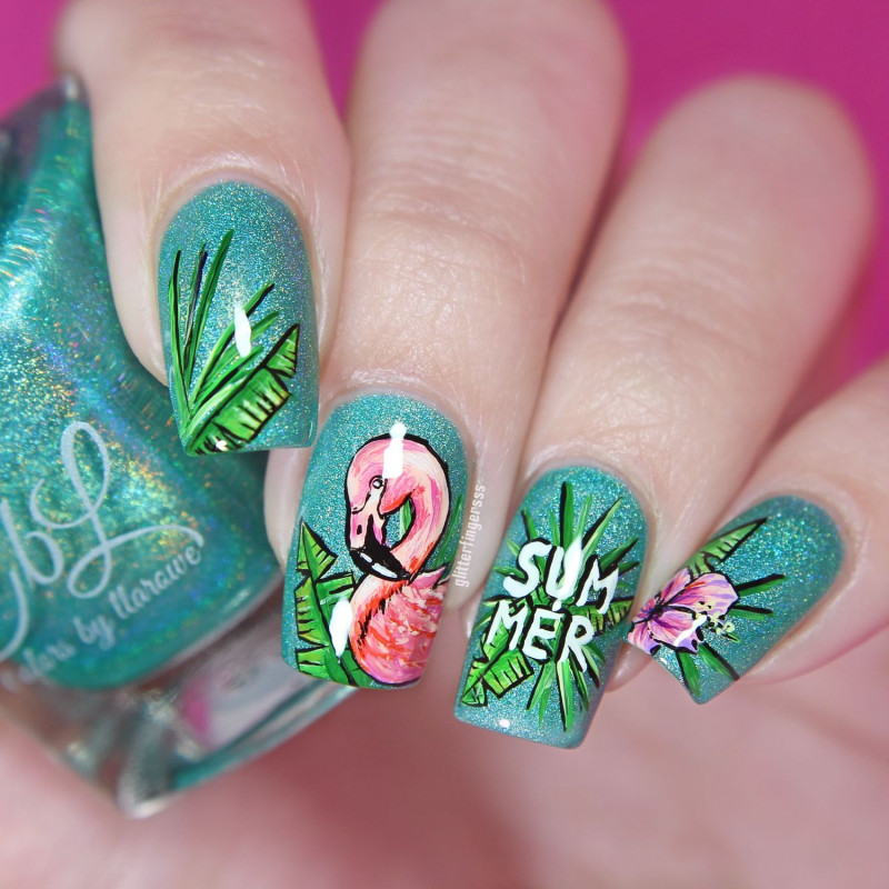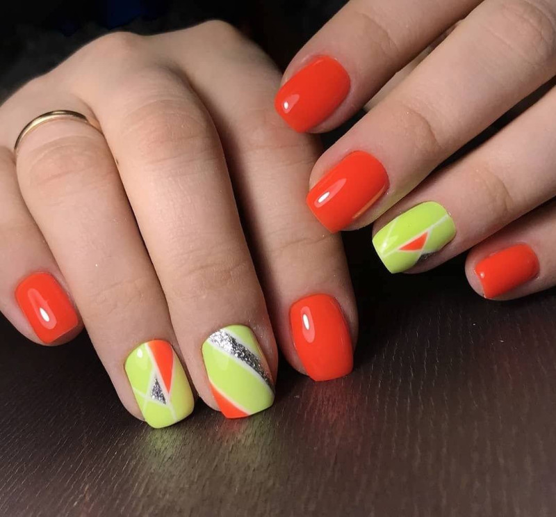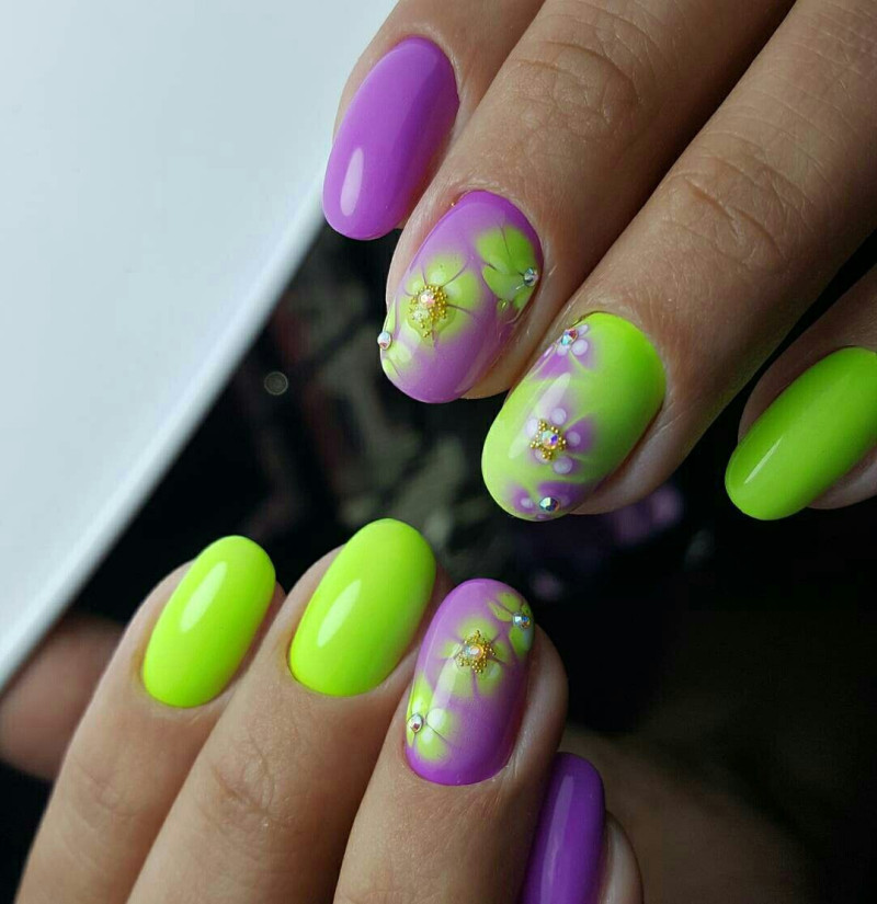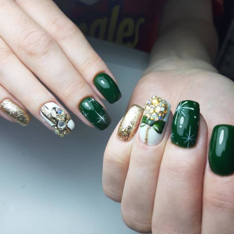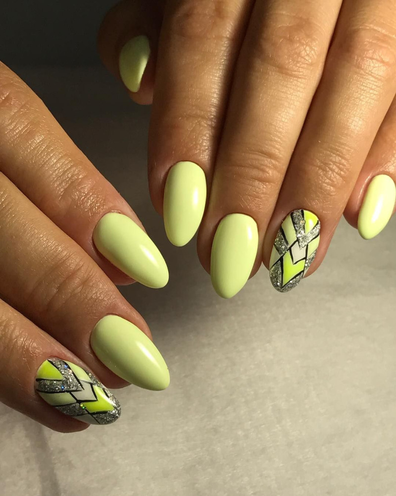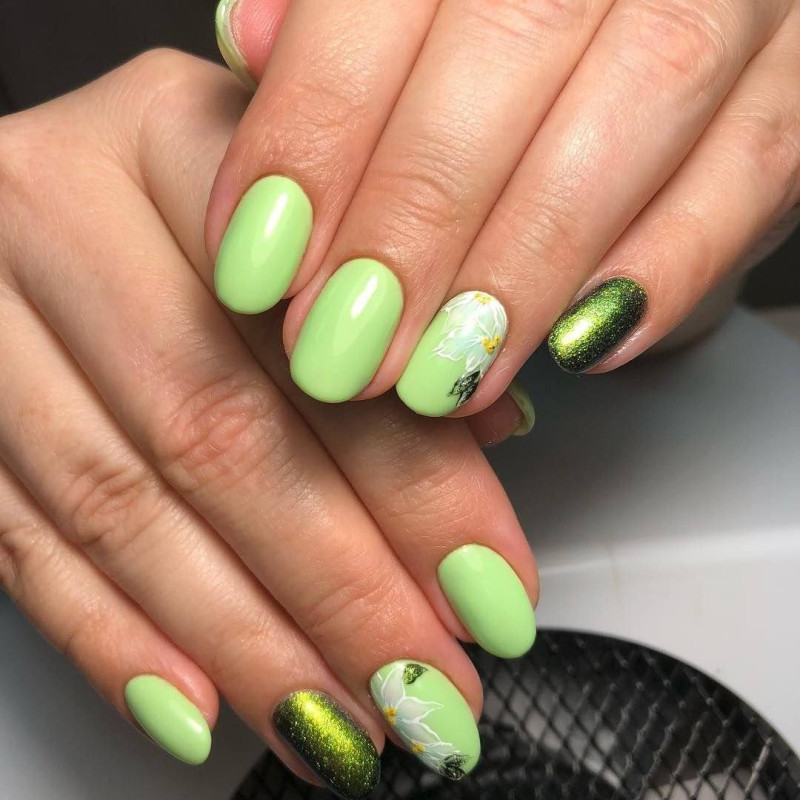 Беспроигрышным вариантом, не зависящим от погоды за окном или стиля одежды, считаются различные полоски, точки, зигзаги и другие геометрические мотивы. Это могут быть как разноцветные, так и однотонные изображения на всех или нескольких ноготках с блестящим контуром или прорисовкой. Не менее эффектно смотрятся различные цветочные композиции на зелёном фоне. Дополнить такие сюжеты можно капельками прозрачной росы, в которой очень красиво отражаются блёстки. Рисунки при этом могут наноситься на основу ногтя при помощи акриловых красок, стемпинга или акриловой пудры. В последнем примере все детали изображения получаются более объёмными. Дизайн в стиле минимализм подразумевает украшение ноготков аккуратными и крохотными фрагментами, что может выражаться в миниатюрных рисунках, блестящей полоски или паре точек.