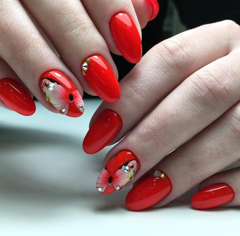 Роскошно выглядят ногти с блестящим покрытием, украшенные аппликациями и объемные фигурками. Они могут располагаться одиночно или формировать композицию. Это могут быть цветы, бабочки, россыпи звездочек или «драгоценных» камней (стразов).