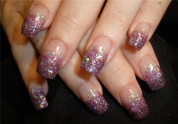 - Можно сделать плавный переход от блесток к обычному однотонному покрытию. Для этого нанесите гель-лак на все ногтевое ложе и кистью со стороны свободного края поместите декор. Будьте аккуратны, чтобы не повредить гель-лак, который останется чистым.
