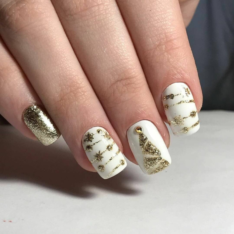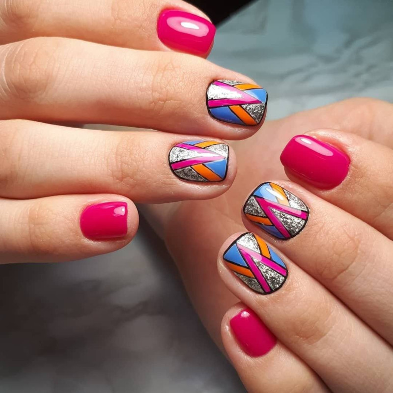 С геометрическими мотивами. Кто сказал, что растяжка блестками должна занимать полностью всю ногтевую пластину?