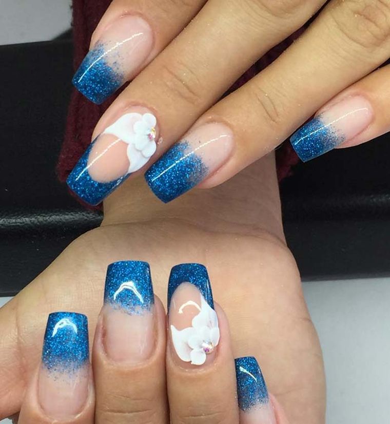 Обладательницы длинных ногтей могут позволить себе любой вид французского маникюра с блестками. Ширина и форма каймы может быть любой. Можно использовать яркие оттенки блесток и лака. Но и перегружать длинную пластину не стоит. Слишком много блеска и декора могут привести к обратному эффекту