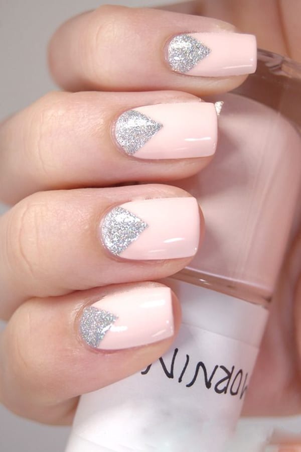 С помощью кисточки нарисуйте лаком с серебряными блестками треугольники на лунках ногтей. Таким образом лучше выделить не один ноготь на каждой руке.