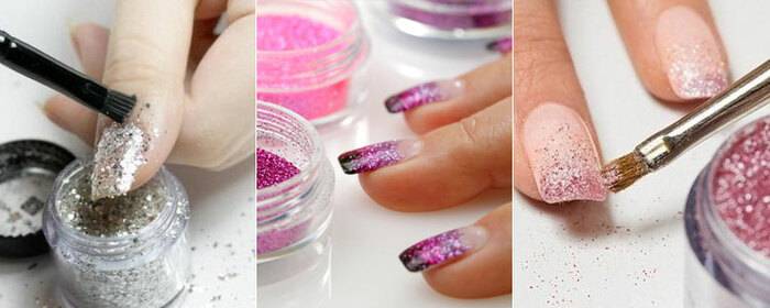 При использовании сыпучих блесток в баночках нужно учитывать, что они очень лёгкие и легко рассыпаются. Чтобы дизайн получился аккуратным, сначала нужно сделать комбинированный маникюр. Далее, когда ноготь подготовлен к покрытию, его поверхность выравнивается слоем базы и просушивается в лампе.