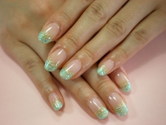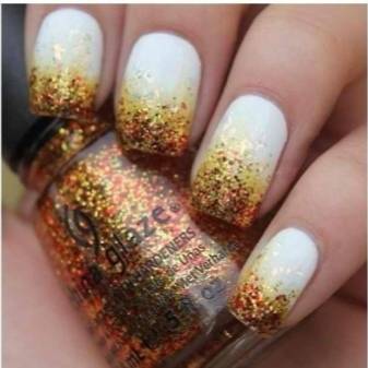 В этом случае на помощь приходит градиент, выполненный с помощью блестящих элементов. Иначе его называют «растяжкой». Чтобы не перегружать ноготки, предпочтительно выбирать глиттер с самыми миниатюрными компонентами, или мелкодисперсную пудру. Растяжку обычно делают от края ноготков к их центру, но есть и вариации: