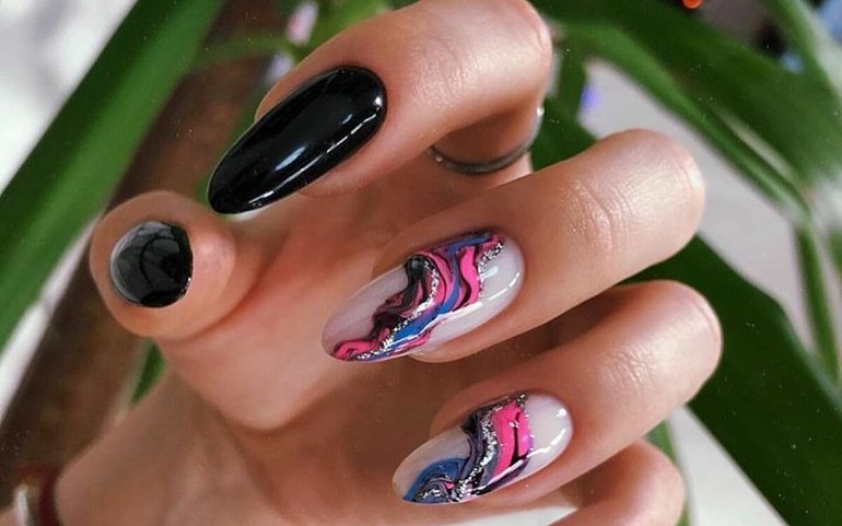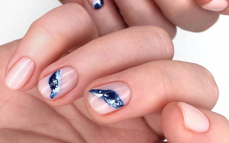 Популярный синий маникюр 2021 — оформление с разводами. Чтобы создать такой нейл-дизайн на палитре поставь 2-3 капли разных оттенков синего и аккуратно смешай между собой, чтобы получили разводы. Затем набирай понемногу и переноси на ноготь. Кстати, лучше всего переносить узор на непросушенный топ – линии будут лучше растекаться и в итоге дадут красивый рисунок.