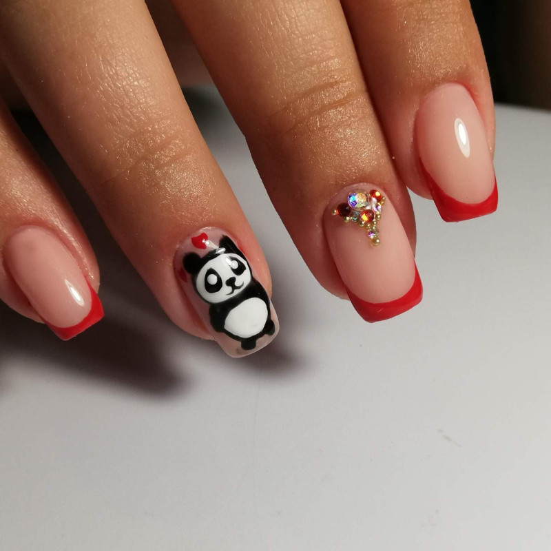 Оформление французского маникюра в красных тонах с использованием страз можно назвать очень красивой и оригинальной дизайнерской идеей, которая, не смотря на мерцание украшений и яркость палитры, всегда смотрится немного сдержанно. К тому же, этот вариант обязательно придётся по душе скромным барышням, не решавшихся ранее на подобный яркий маникюр. Самым распространённым видом красного френча считается покрытие кончика ногтевой пластины выбранным красным оттенком. Основная часть ноготка при этом остаётся прозрачной. Привлекательность такой техники заключается в форме улыбки. Вы можете отдать предпочтение классической закруглённой линии, либо немного поэкспериментировать и оформить треугольную, скошенную или даже очень широкую улыбку, которая будет занимать половину всего ногтя. Последнее предложение актуально для длинных ноготков. Стразы при этом красиво подчеркнут границу между цветным и прозрачным покрытием либо могут располагаться в виде небольших узоров на нескольких пальцах.