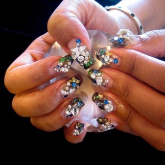 Камни для маникюра могут обычными многогранниками с четкими линиями, могут быть кристаллы, похожи на битое стекло, конусные стразы, шармы, жемчужины.