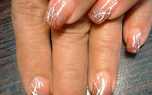 - Еще на невысохший лак наносятся блестки. Украшение следует нанести на кончик свободного края ногтя;