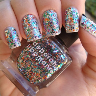 Самый простой вариант – лак с блестками. Он может иметь прозрачную основу и цветные блестки, а также яркую или пастельную основу. Блески с прозрачной основой можно наносить на прозрачную базу или на цветной лак выбранного оттенка. Если после первого нанесения вы не довольны результатом, нанесите второй слой, чтобы увеличить количество блесток и насыщенность маникюра.