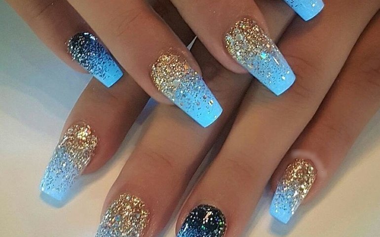 Не забывай про синий маникюр с дизайном в виде россыпи блесток у основания ногтевой пластины. Самый же модный маникюр в этой технике — молочный градиент с заливкой блесток или пайеток.