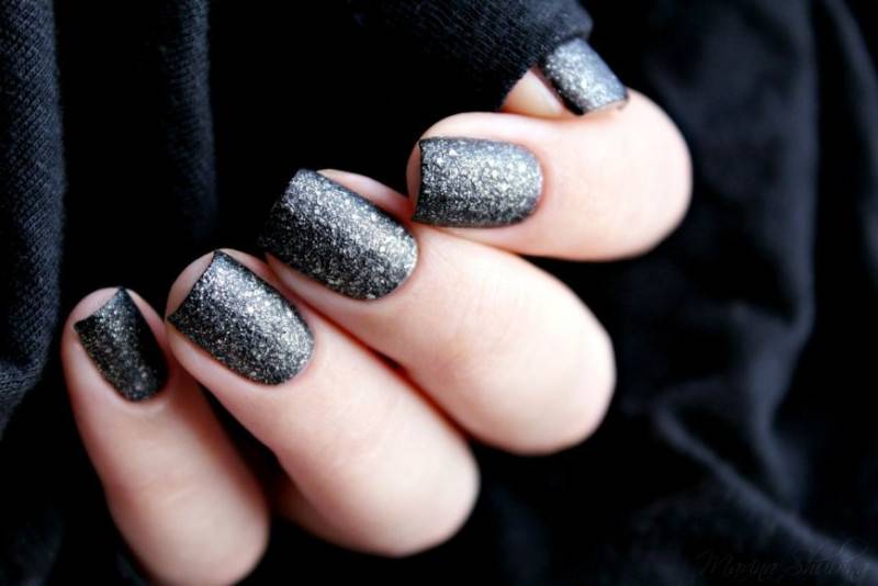 - С помощью декоративной пыли. На ногтевые пластины следует нанести базу или прозрачный лак. Поверх можно посыпать покупной темной пыльцой (иногда она с блестками). В итоге получается блестящий, шершавый матовый маникюр.