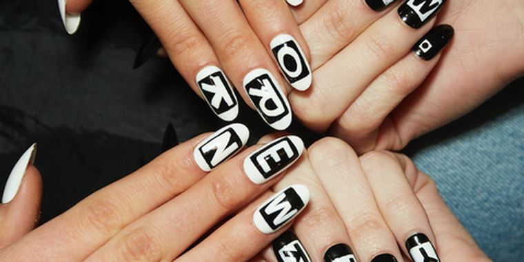 Надписи могут быть и черного цвета. Один из вариантов трендового маникюра — темный текст на белой или нюдовой подложке. При этом светлым будет только один ноготь, все остальные — черные.