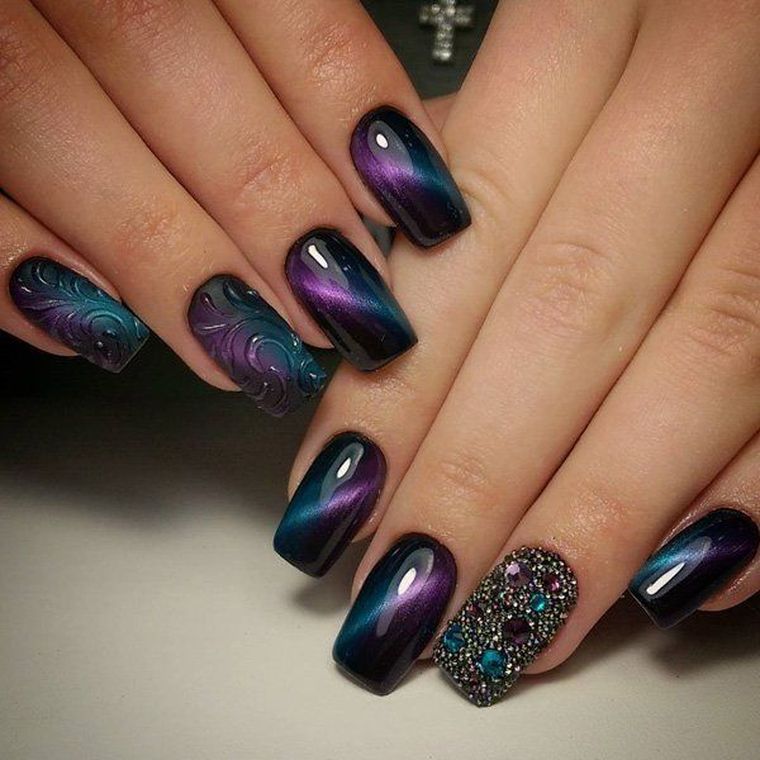 Важно выбирать контрастные цвета для нанесения декора, чтобы избежать, слияния его с основным цветом. Допускается использование страз, блёсток и фольги; Градиентный вид маникюра и омбре. Эти великолепные переходы, могут сделать выразительным любой маникюр