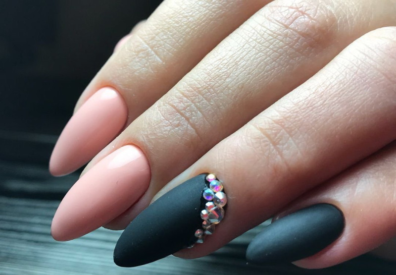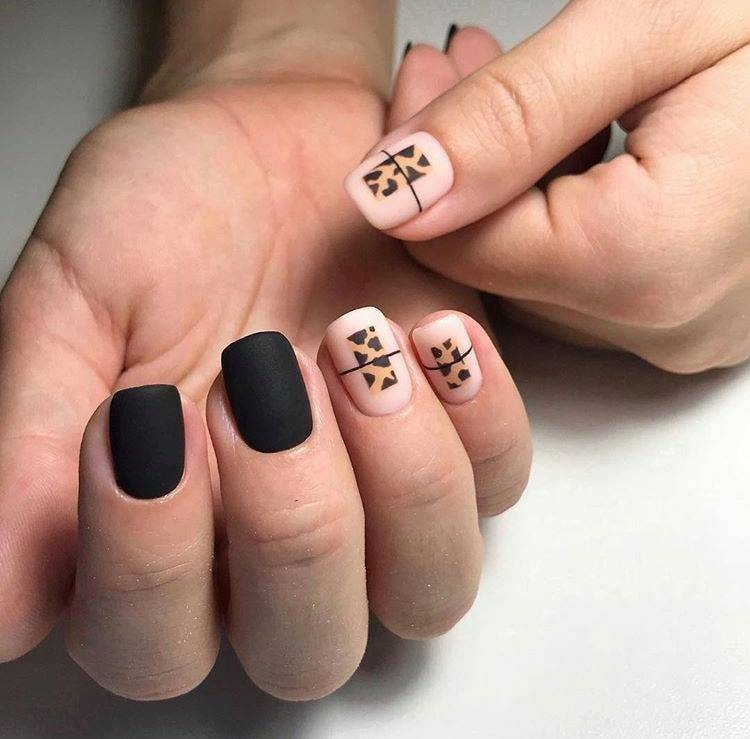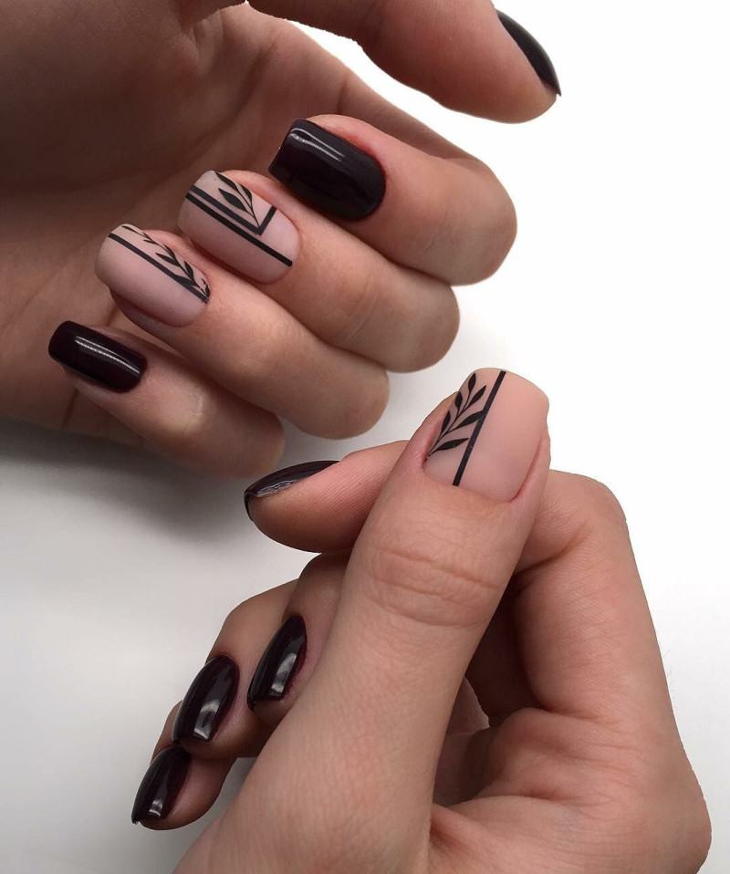 Нежные оттенки нюд прекрасно сочетаются с черным матовым лаком. Это добавит нежности и романтичности вашему маникюру.