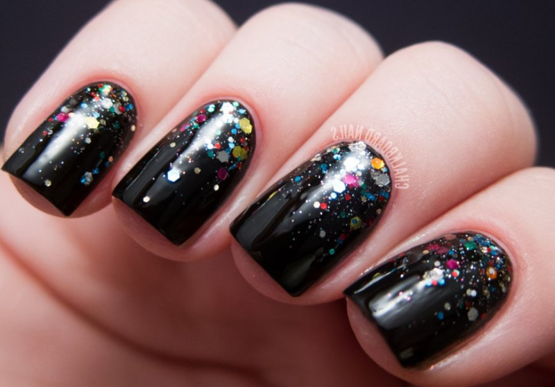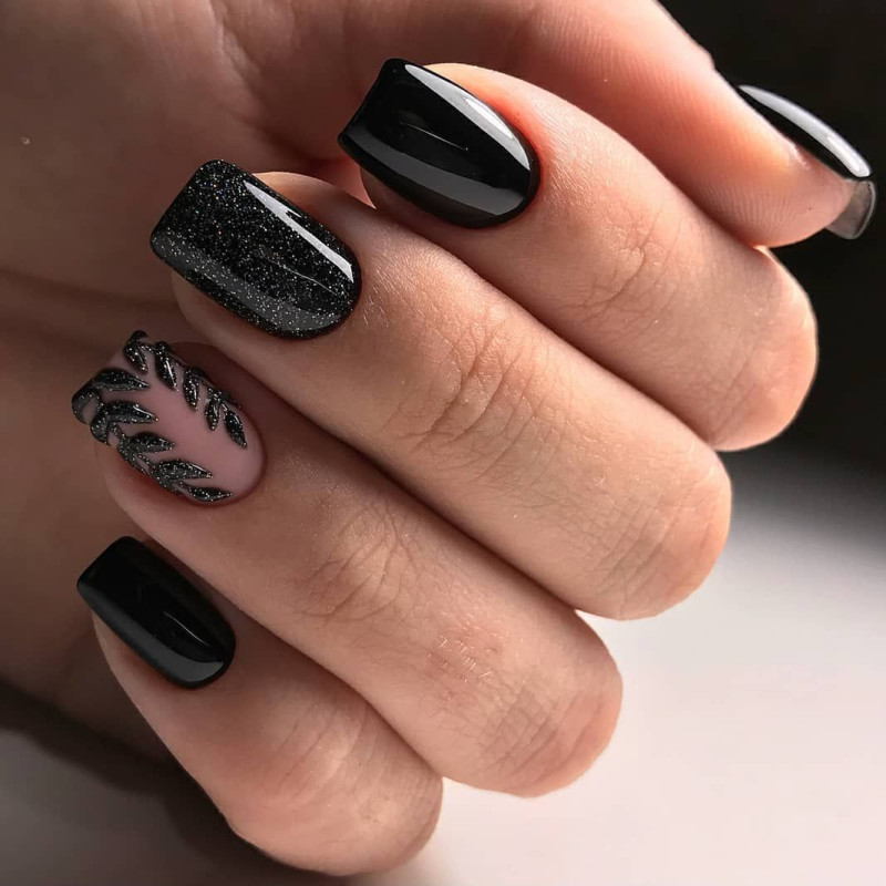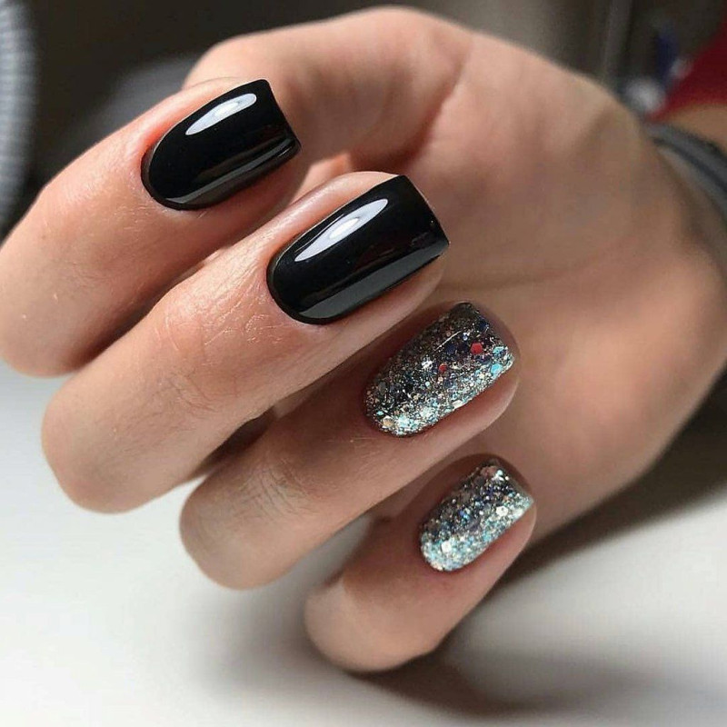 Стилисты советуют наносить декор только на несколько ногтей, чтобы маникюр не выглядел вульгарно. Например, можно выложить блестки на безымянный палец и сделать матовое покрытие, а остальные покрасить черным глянцевым лаком.