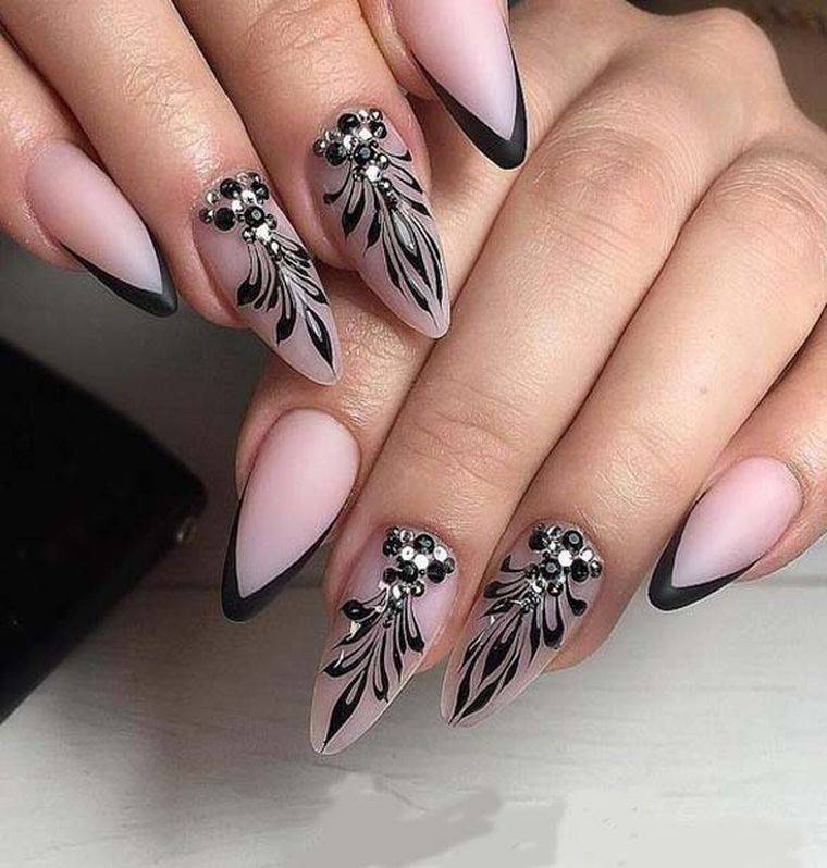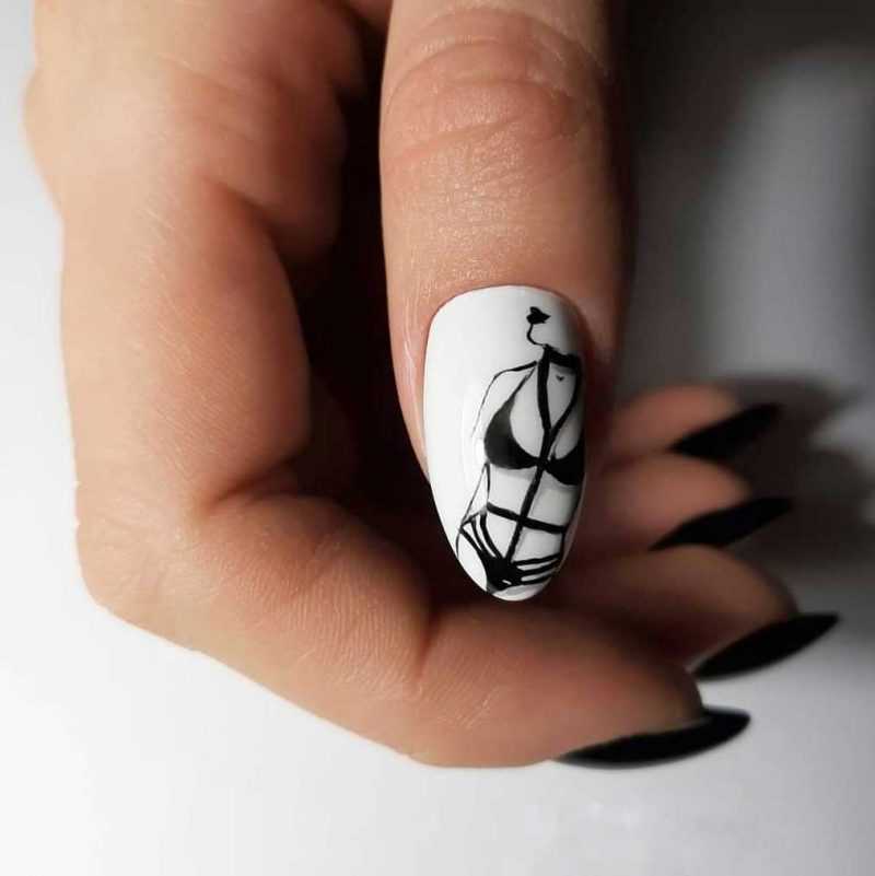 Французский маникюр в чёрно белом цвете, выглядит смело, но удивить просто чёрной улыбкой, не получится. Необходимо добавить немного декора. Можно украсить улыбку стразами, глиттером или использовать втирку. Красиво смотрится роспись на чёрной улыбке. Допускается разделение улыбки и основного цвета, другим цветом лака или стразами; Чёрно – белые цвета в лунном стиле. Допускаются всевозможные эксперименты с различной формой луны, расположенной в разной части ногтя. Добавьте немного декора контрастным цветом или глиттером и вы получите, невероятно красивый маникюр. Для более ежедневного маникюра, можно выбирать постельные тона, а для праздничных мероприятий, используйте втирку, глиттер, стразы и т. д.; Сочетание чёрного и белого в рисунках; Геометрические формы и точки. Этот вид нанесения, тоже пользуется популярностью в нынешнем сезоне и сделает ярким и стильным ваш маникюр